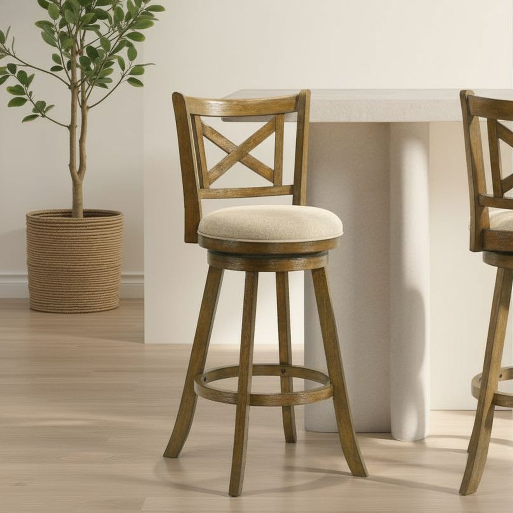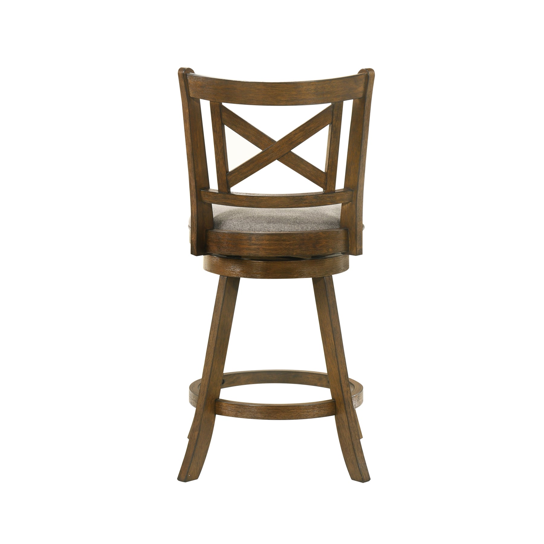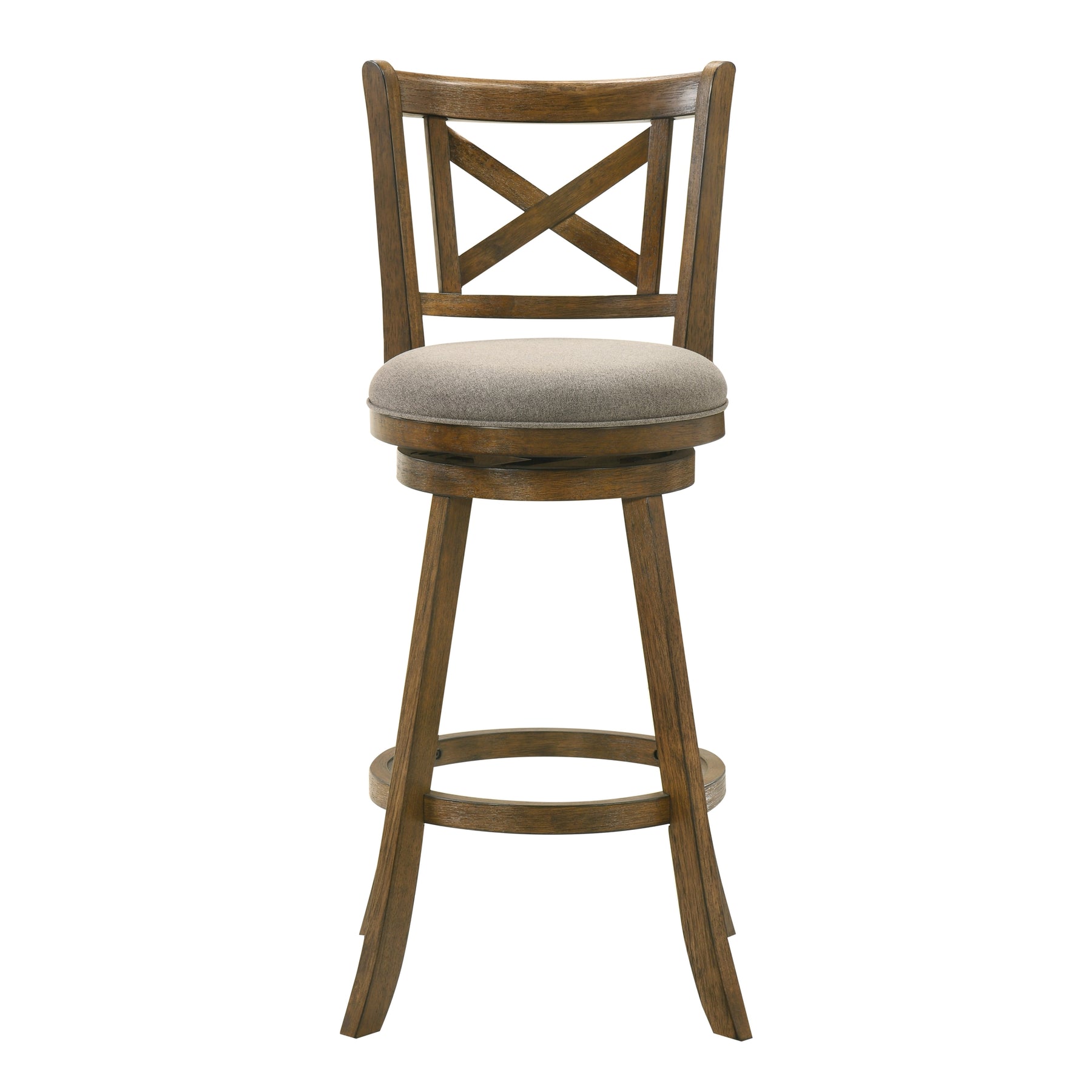 The Kodi Barstool Collection captures the warmth of classic design with the durability and comfort required for modern living. Its elegant X-back frame and gently curved legs bring a timeless farmhouse charm, while the sleek round seat and 360-degree swivel base add functionality for everyday use. Whether placed at a kitchen island or a home bar, Kodi delivers a perfect balance of style, comfort, and craftsmanship. Built from solid natural wood with a rich Sepia Brown finish, each stool showcases a warm tone that enhances natural wood character while offering strength and long-lasting performance. The upholstered seat is available in Static Gray or Light Scone,two versatile, neutral fabric options that pair beautifully with the finish and easily blend with a variety of color palettes. The performance-grade fabric offers soft comfort while resisting wear, helping maintain its appearance through years of use. The 360-degree swivel seat allows for smooth rotation, making conversation easy and movement effortless, while the circular footrest provides added support for relaxed sitting. Its rounded seat with thick foam padding ensures consistent comfort during long gatherings. Designed for convenience, the stool is available in Counter Height and Bar Height, fitting seamlessly into casual dining spaces and kitchen setups alike. Assembly is simple, requiring minimal effort with all hardware included. The Kodi Barstool Collection is backed by a 1-year limited manufacturer warranty, guaranteeing dependable quality. Perfect for rustic, transitional, or farmhouse interiors, Kodi brings enduring character and functionality to every space.Product Dimensions