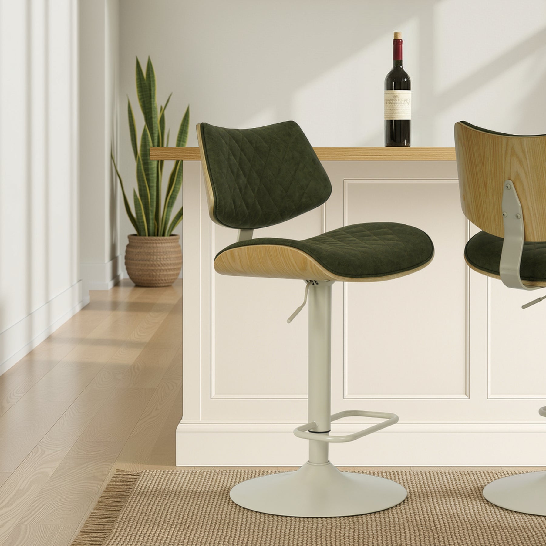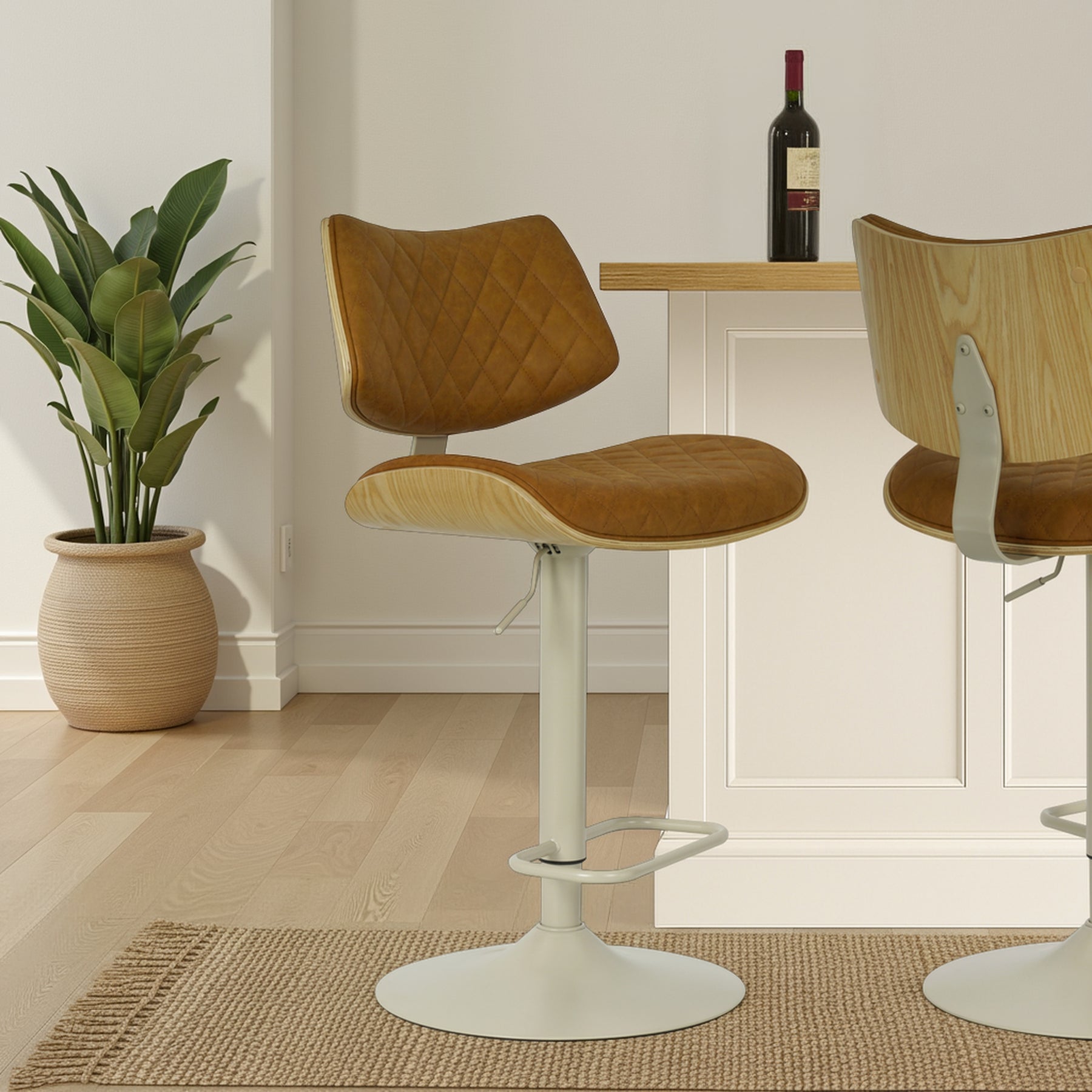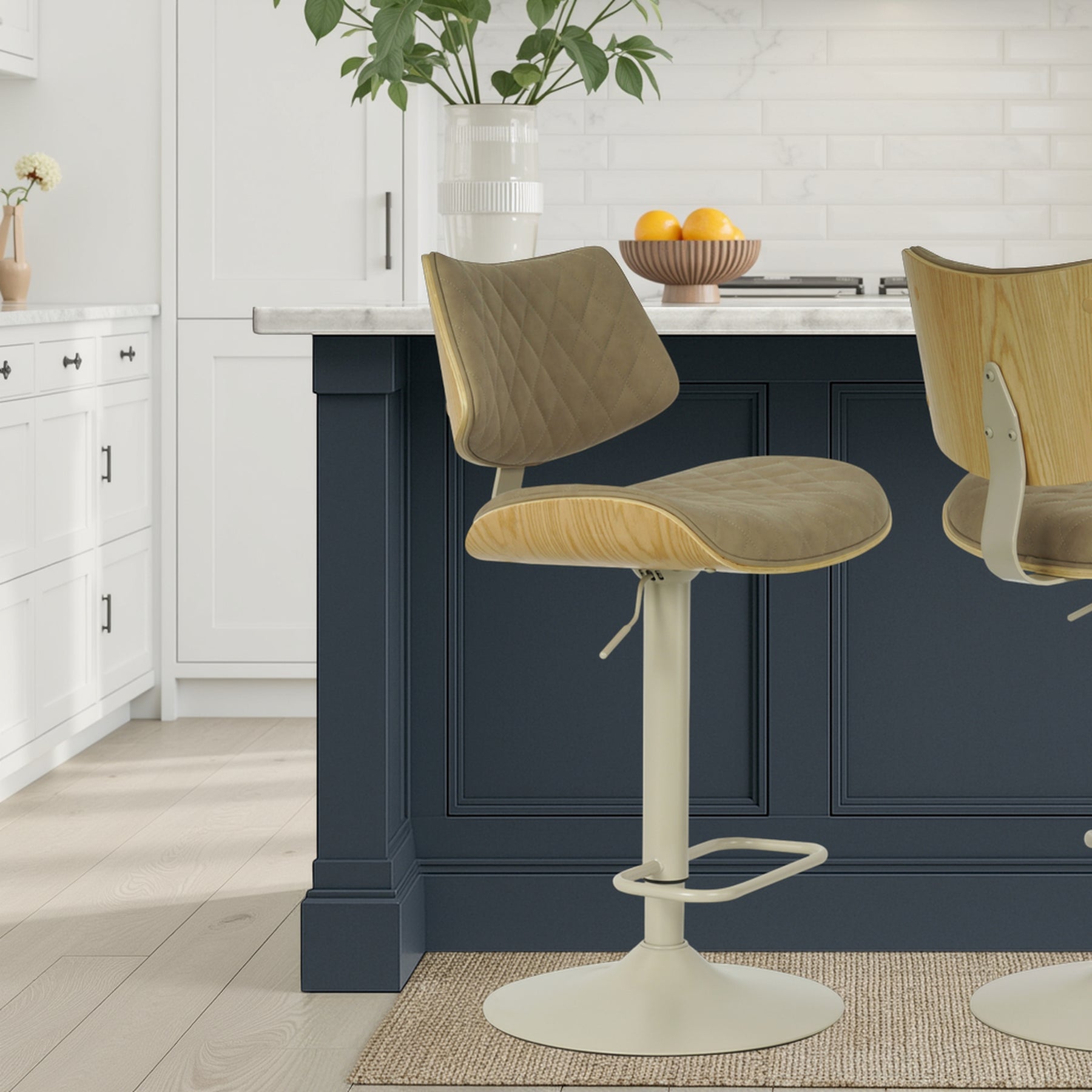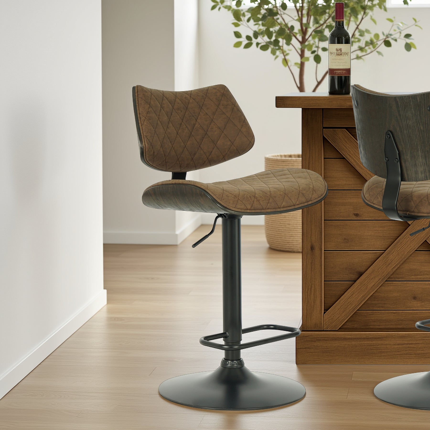 The Leland Adjustable Gray Faux Leather and Black Finish Bar Stool is the chic and clean stool to bring into your living area. The Leland is upholstered in a piece of stunning faux leather, featuring a bold and beautiful diamond-tufted design. The Leland is crafted with utility in mind - proudly touting two amazing additions: a 360-degree swivel function and an adjustable lever for the perfect height! The Leland is available in your color choice of Gray, cream, or black faux leather with chrome finish or Gray faux leather with black finish. Product Dimensions: W:19 x D:20 x H:37 - 45 x SH:24 - 33Product Dimensions