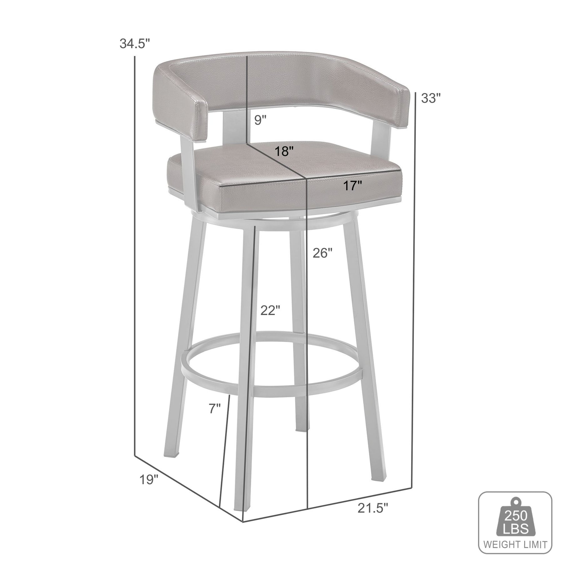 The unique style of the Lorin Swivel Bar Stool from Armen Living is unmatched; whether it is the aesthetic or quality, it is hard to find a stool as wonderful as this. The contemporary round silhouette is unlike most bar stools and includes a wide, open-lower back design for cool breathable seating. The Lorin Bar Stool can easily transition from your kitchen to your dining room, to your dining room to the living room, the versatile look makes these possibilities endless. The Lorin features a thick foam-padded cushion that will keep you relaxed until you are ready to get up! This stool comes in your color choice of Black, Gray, and White Faux Leather. It is also available in your choice of 26" counter height and 30" bar height.Product Dimensions