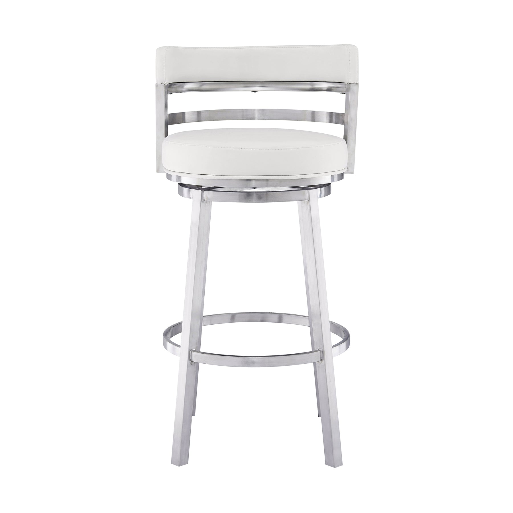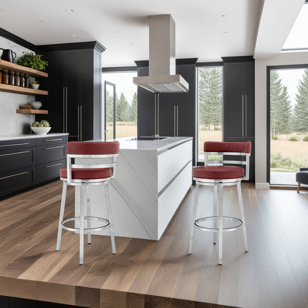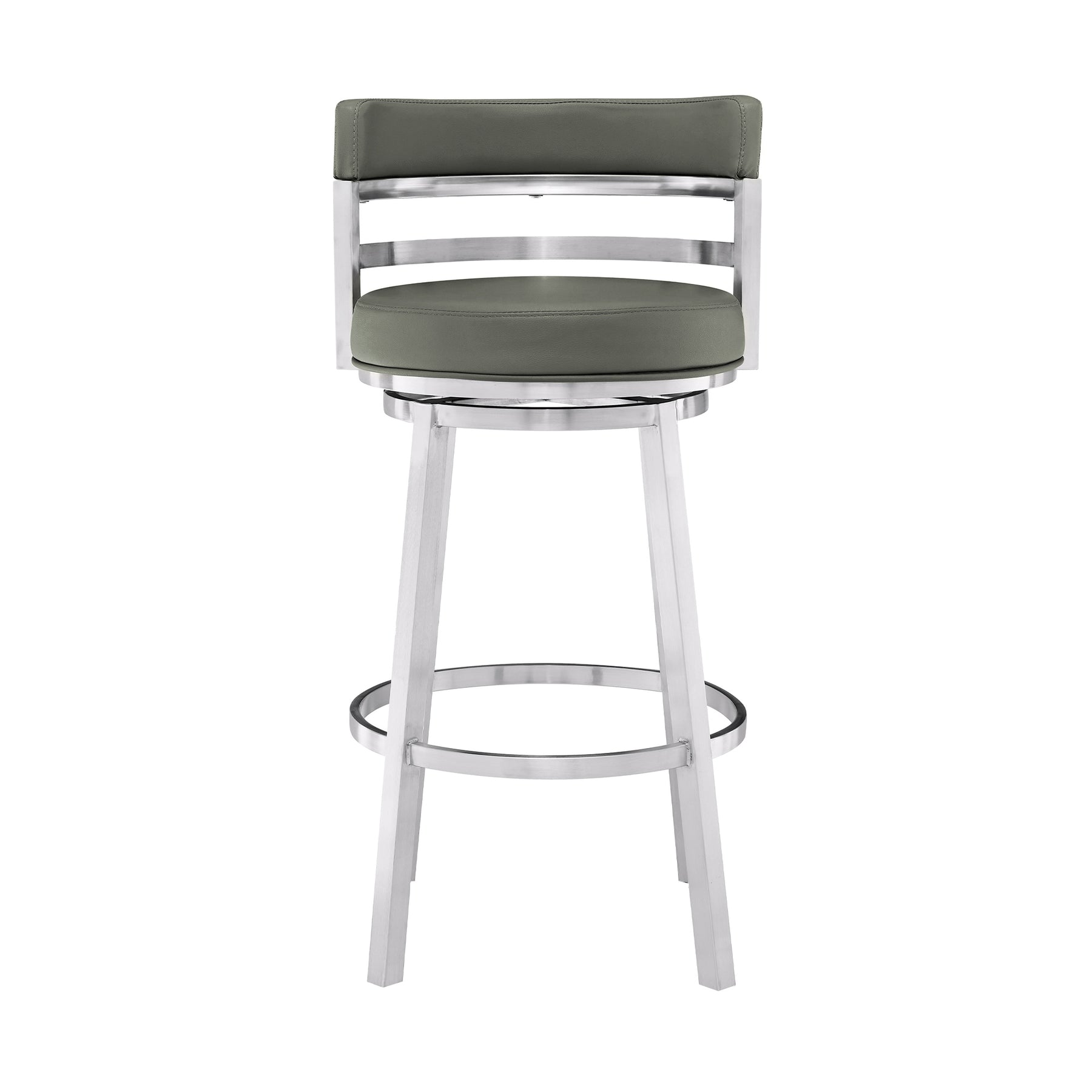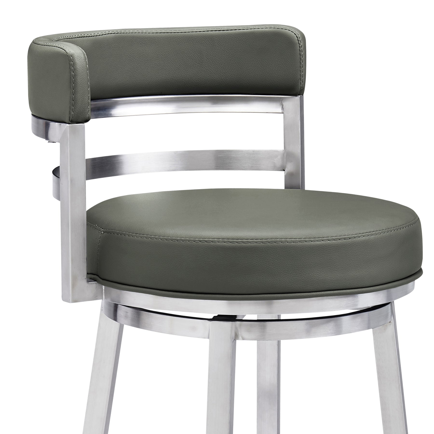 Glam up your space with our sleek and charming Madrid Swivel Counter or Bar Height Stool in Metal and Faux Leather by Armen Living. The streamlined silhouette and elegant mixed materials of our barstool offer eye-catching style and comfort. Its curved and padded backrest provides comfortable support, while the round seat is upholstered with faux leather, for a smooth and chic look. Faux leather is stain, scratch, and water-resistant for easy care and maintenance. This barstool delivers a modern and minimalism aesthetic with the streamlined base and smooth, round seat. Its upholstered low back provides exceptional ergonomic support and comfort anywhere from your kitchen to your home office. The Madrid barstool exquisitely suits your kitchen island, pub table, home bar, or adjustable desk with its simple, armless design and smooth gliding 360-degree swivel function that allows for maximum mobility and convenience in tight spaces. The Madrid's legs are tipped with floor protectors, ensuring that the bar stool will not slip on or scratch hardwood or tile floors, making this a durable bar stool that will last for many years to come. The built-in circular footrest and cushions constructed from high-density foam and wrapped in soft faux leather upholstery will keep you comfortably seated for hours on end. The Madrid Swivel Counter or Bar Height Stool is available in: Brushed Stainless Steel with Red, Blue, Gray, White, or Black faux leather to elevate any corner of your home.
