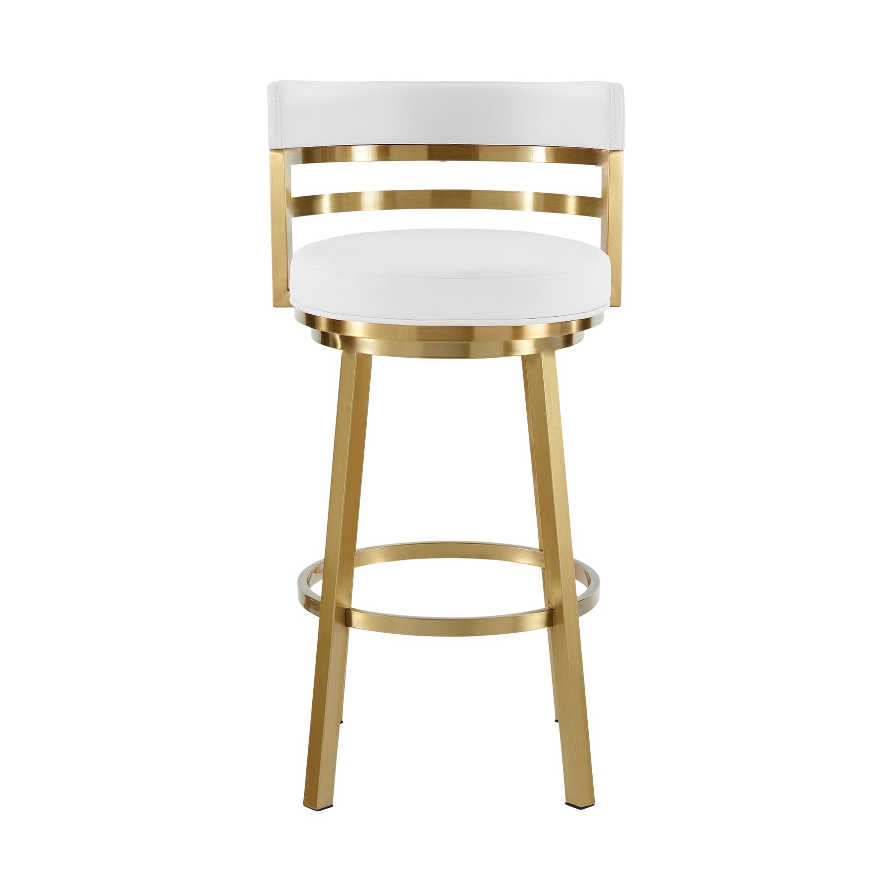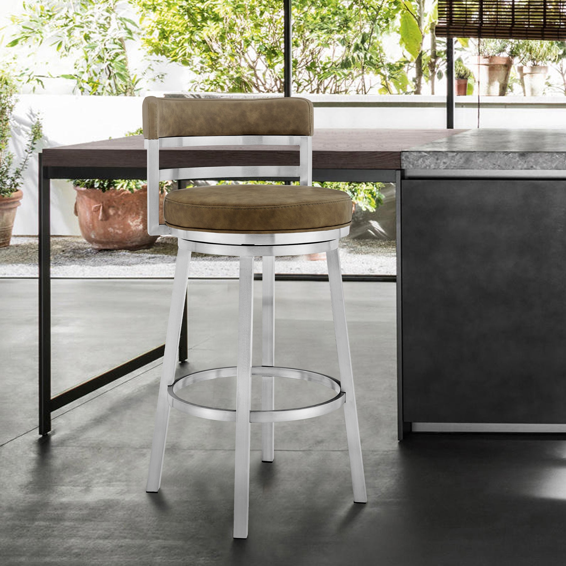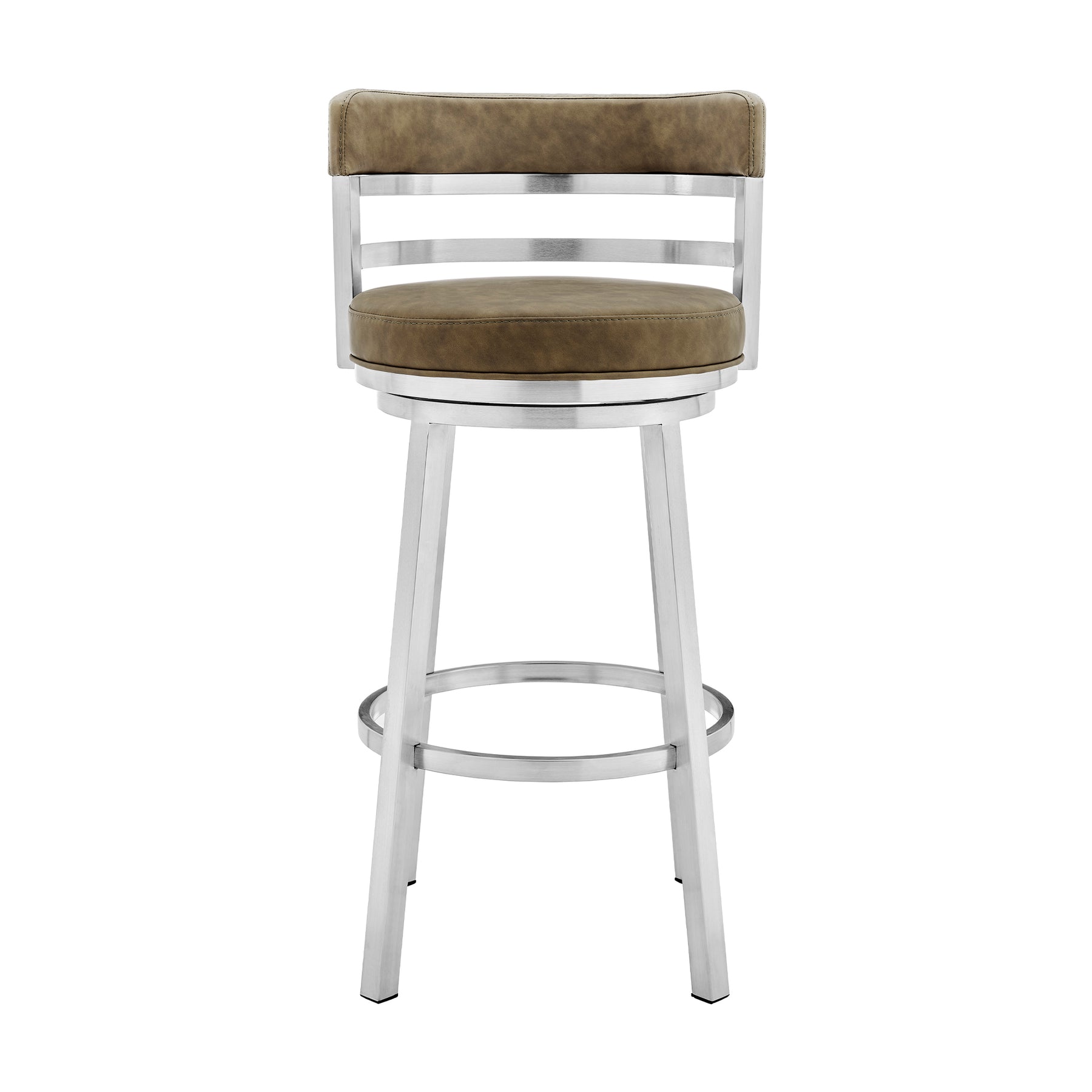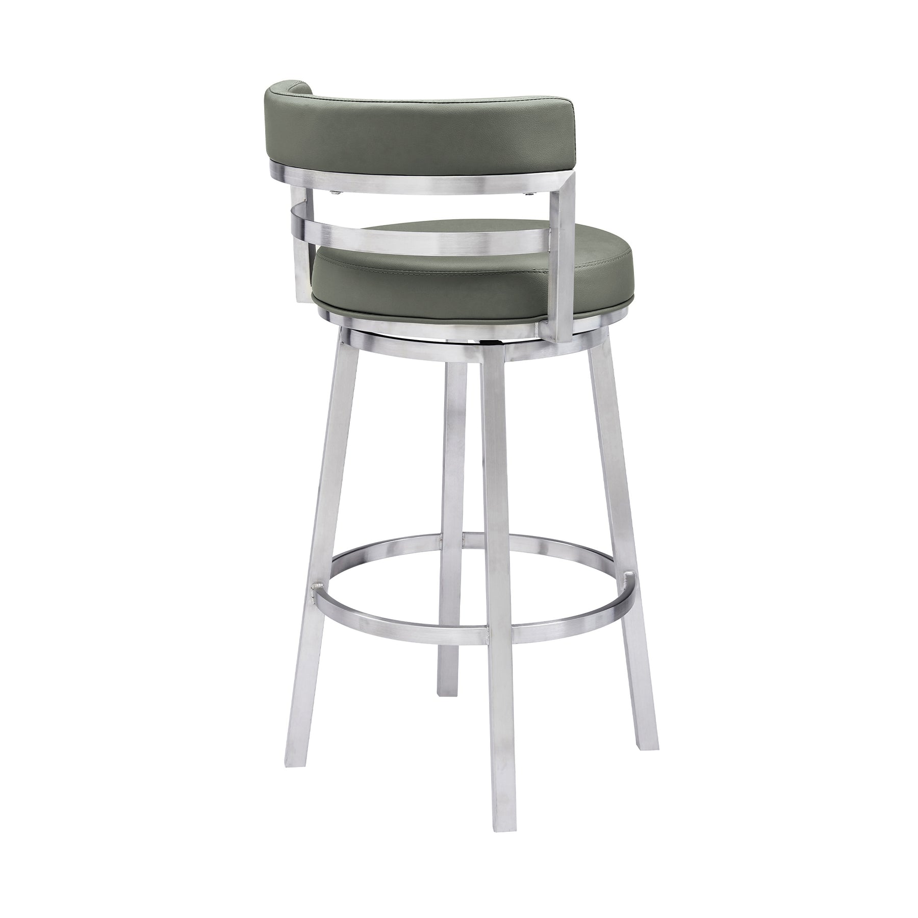 Glam up your space with our sleek and charming Madrid Swivel Counter or Bar Height Stool in Metal and Faux Leather by Armen Living. The streamlined silhouette and elegant mixed materials of our barstool offer eye-catching style and comfort. Its curved and padded backrest provides comfortable support, while the round seat is upholstered with faux leather, for a smooth and chic look. Faux leather is stain, scratch, and water-resistant for easy care and maintenance. This barstool delivers a modern and minimalism aesthetic with the streamlined base and smooth, round seat. Its upholstered low back provides exceptional ergonomic support and comfort anywhere from your kitchen to your home office. The Madrid barstool exquisitely suits your kitchen island, pub table, home bar, or adjustable desk with its simple, armless design and smooth gliding 360-degree swivel function that allows for maximum mobility and convenience in tight spaces. The Madrid's legs are tipped with floor protectors, ensuring that the bar stool will not slip on or scratch hardwood or tile floors, making this a durable bar stool that will last for many years to come. The built-in circular footrest and cushions constructed from high-density foam and wrapped in soft faux leather upholstery will keep you comfortably seated for hours on end. The Madrid Swivel Counter or Bar Height Stool is available in: Brushed Stainless Steel with Red, Blue, Gray, White, or Black faux leather to elevate any corner of your home.