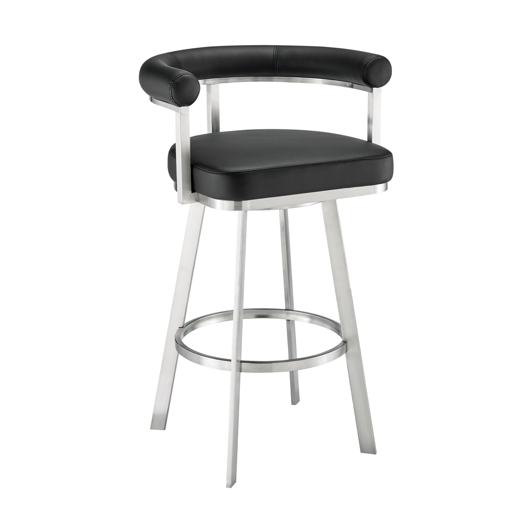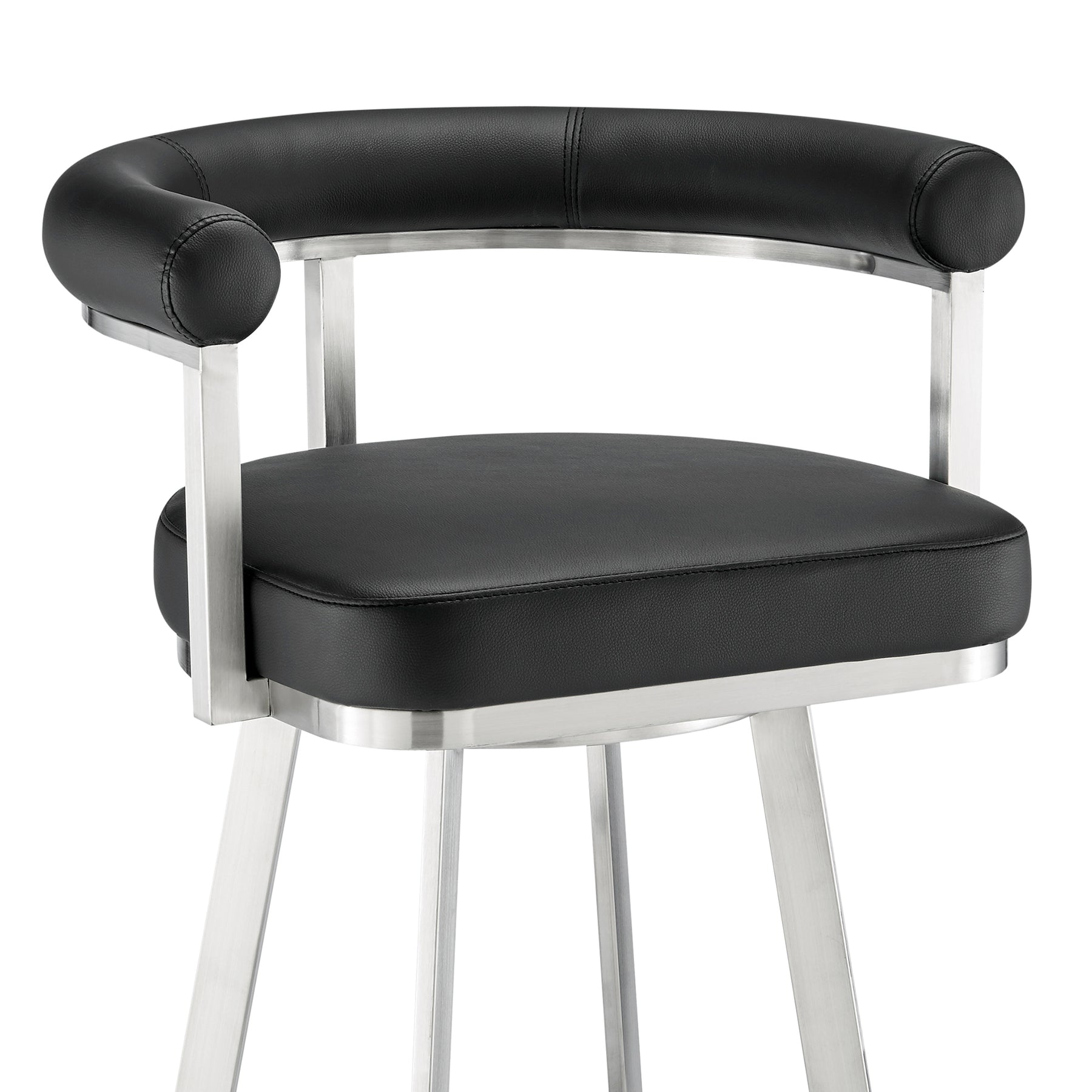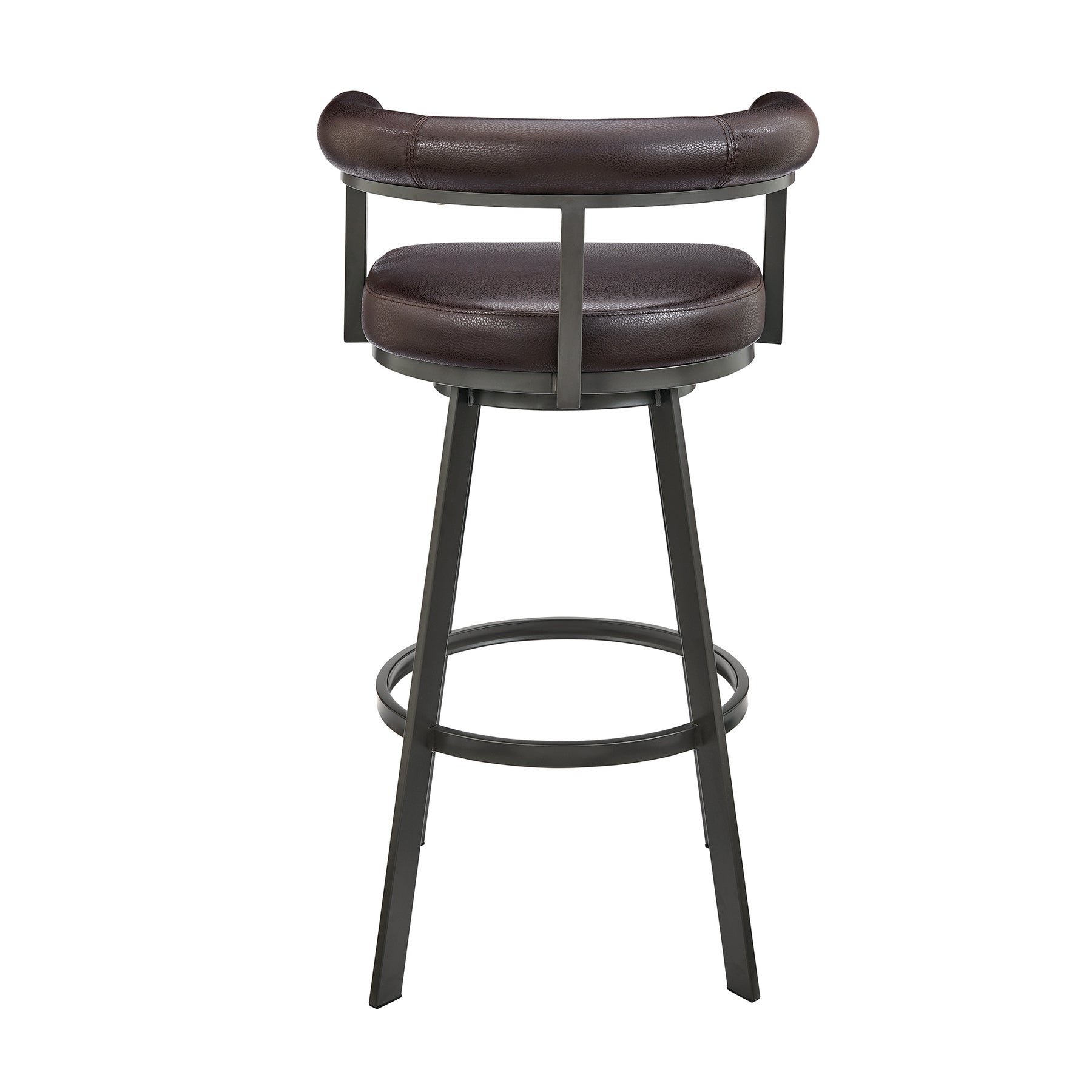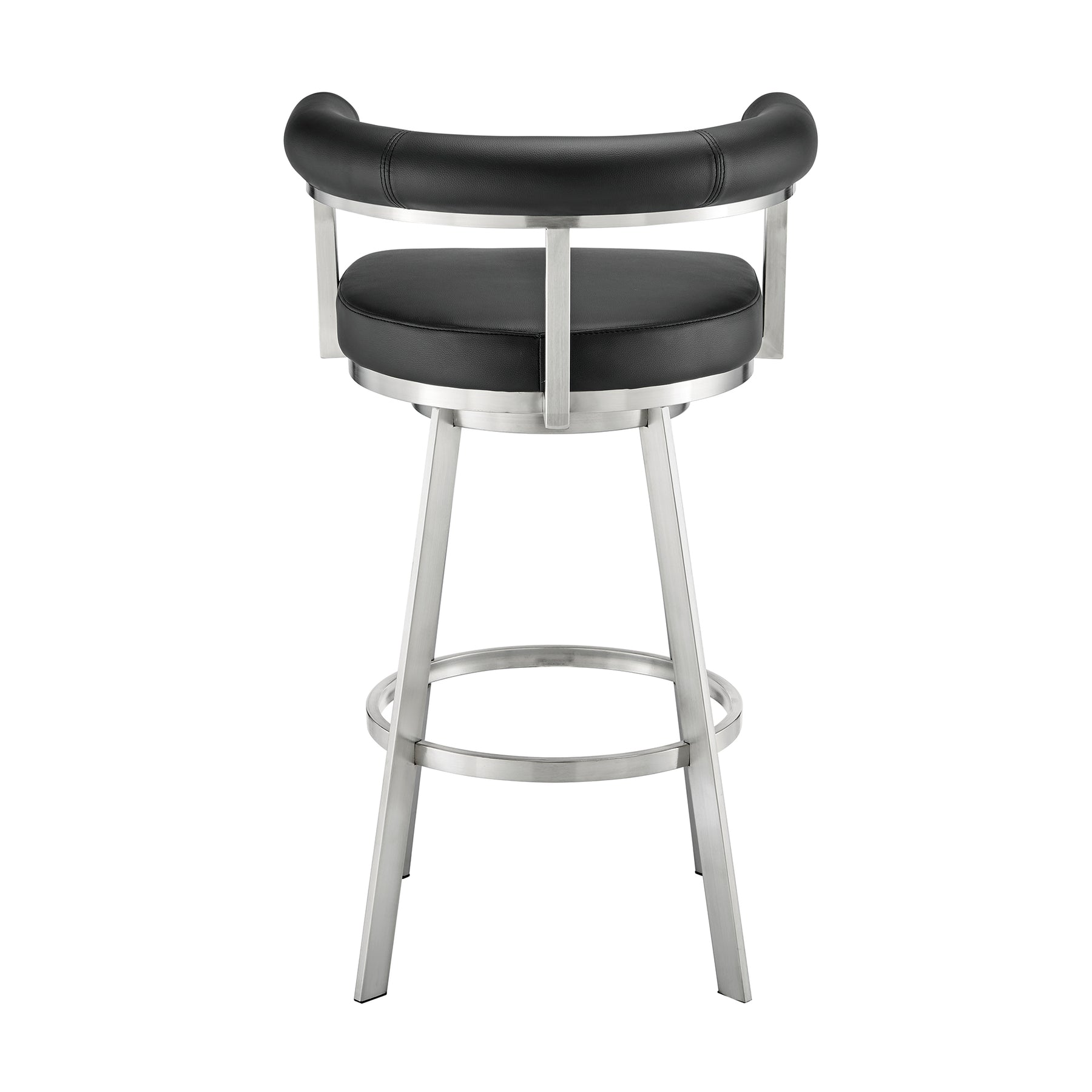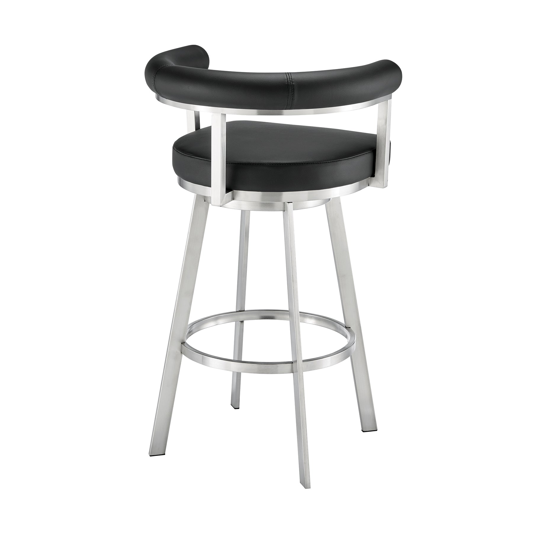 Elevate your space with the flair of our Magnolia swivel chair, bar stool or counter height stool in faux leather and metal from Armen Living. Featuring a minimal and streamlined barrel back, this mid-century modern counter stool exudes a sleek and inviting look. Plush cushioning at the back and the padded seat provide a comfortable seating experience, while the open back design allows for breathability. Elevated by a chic metal frame, our stylish counter stool or barstool makes a powerful design statement. Upholstered in faux leather, it ensures a comfortable experience at high dining areas, kitchen counters, or worktables. Faux leather's durability ensures it won't easily crack, stain, fade, or be affected by UV exposure. Counter or bar-height stools with a swivel mechanism offer added convenience for daily use and entertaining. The full 360-degree swivel chair function provides maximum mobility, and the smooth glide swivel allows you to change directions effortlessly, making it your new favorite seat at home. The Magnolia faux leather and metal kitchen barstool is available in a black finish with brown or gray faux leather, a brushed stainless-steel finish with your choice of black, light gray, or white faux leather, or a java brown finish with chocolate faux leather upholstery. This barstool is available in both 26-inch seat height and 30-inch seat height options..