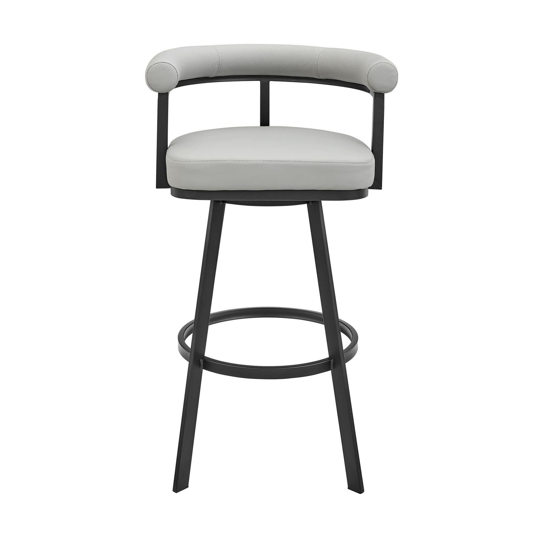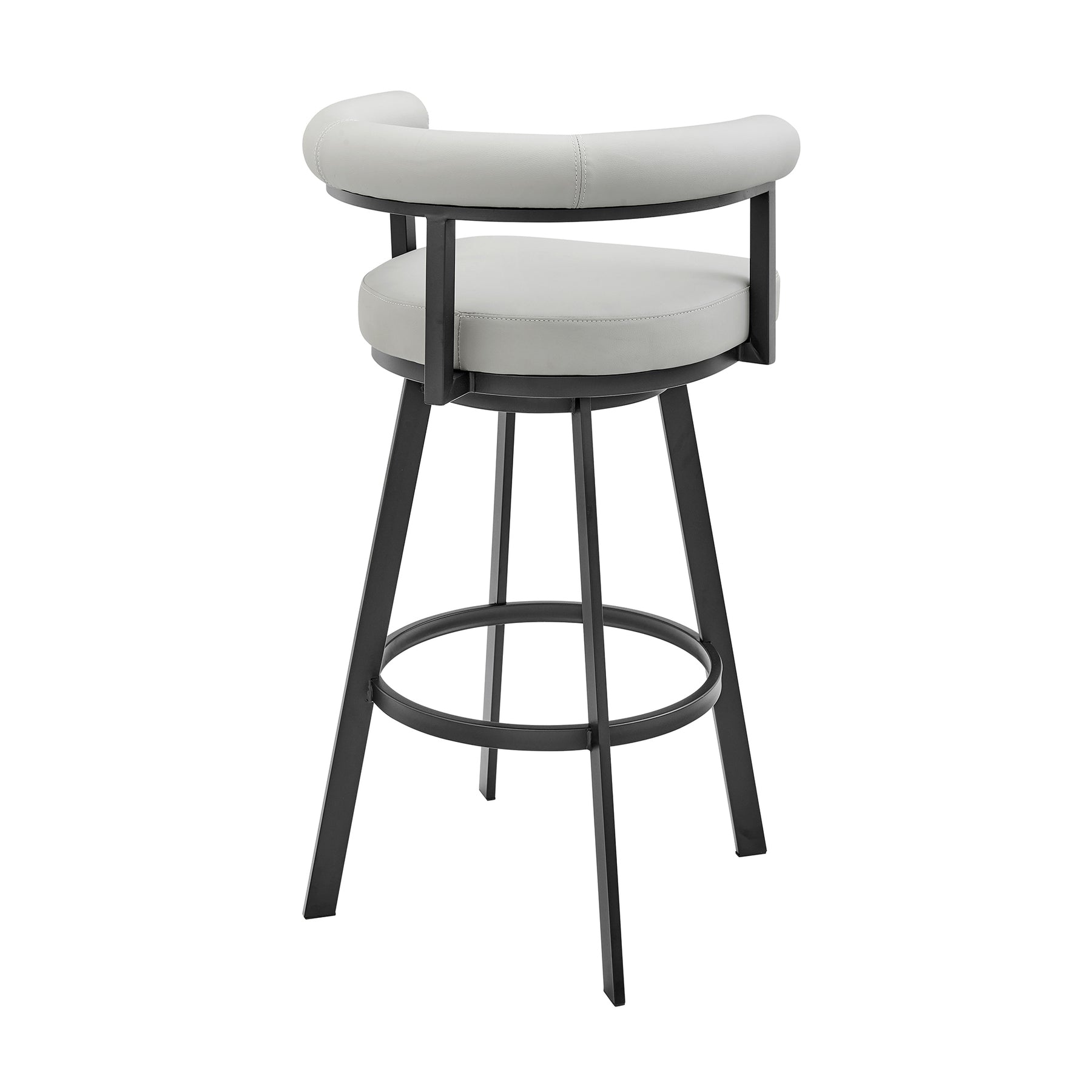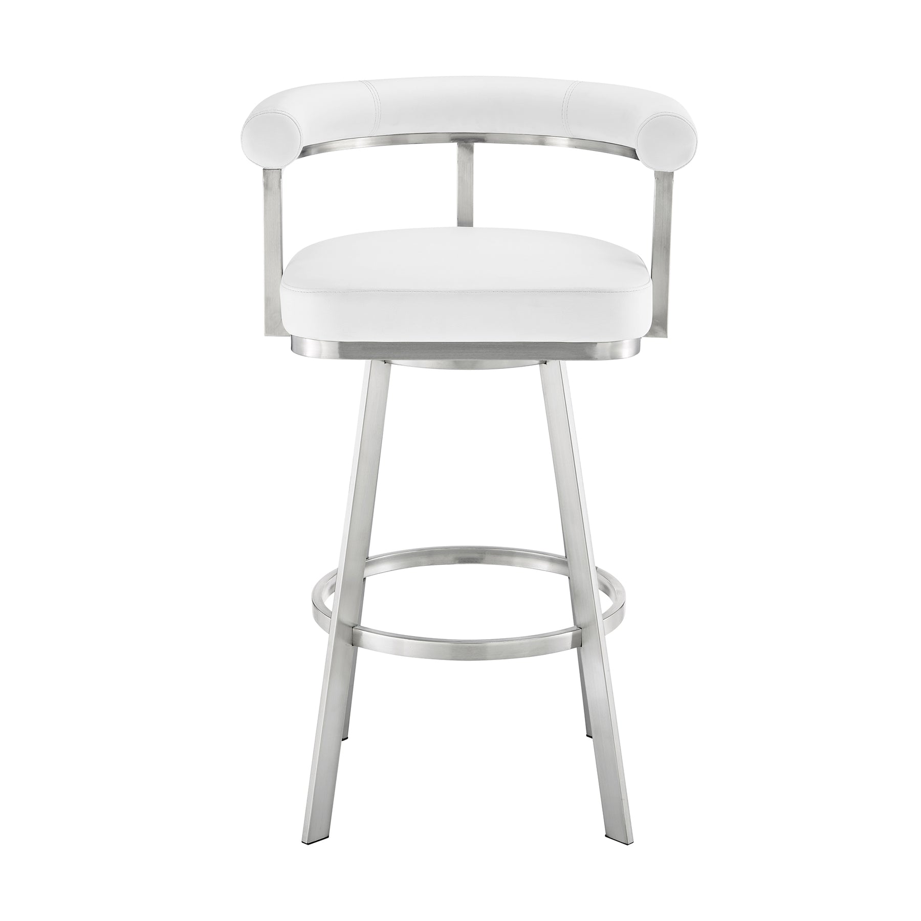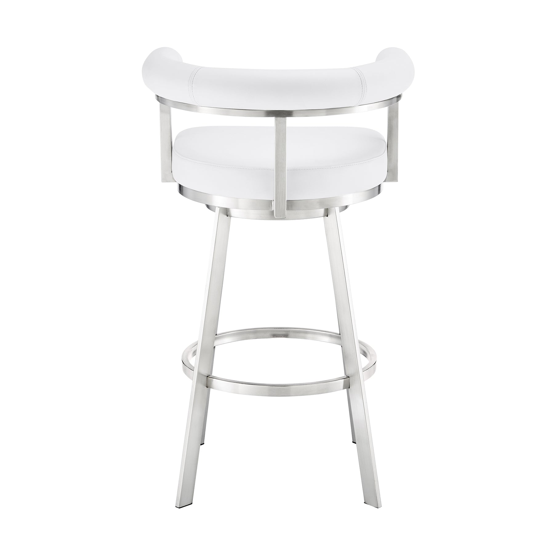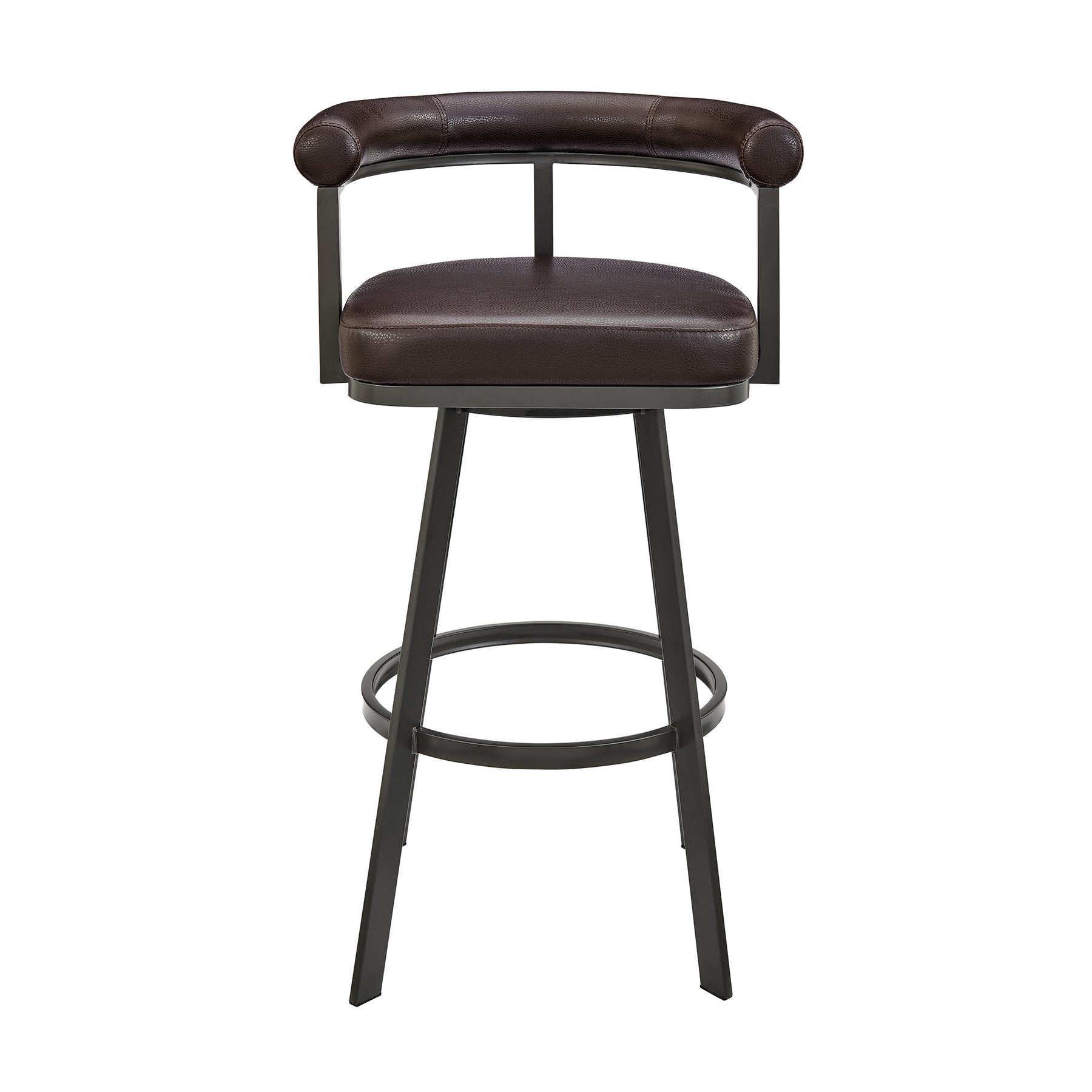 Elevate your space with the flair of our Magnolia swivel chair, bar stool or counter height stool in faux leather and metal from Armen Living. Featuring a minimal and streamlined barrel back, this mid-century modern counter stool exudes a sleek and inviting look. Plush cushioning at the back and the padded seat provide a comfortable seating experience, while the open back design allows for breathability. Elevated by a chic metal frame, our stylish counter stool or barstool makes a powerful design statement. Upholstered in faux leather, it ensures a comfortable experience at high dining areas, kitchen counters, or worktables. Faux leather's durability ensures it won't easily crack, stain, fade, or be affected by UV exposure. Counter or bar-height stools with a swivel mechanism offer added convenience for daily use and entertaining. The full 360-degree swivel chair function provides maximum mobility, and the smooth glide swivel allows you to change directions effortlessly, making it your new favorite seat at home. The Magnolia faux leather and metal kitchen barstool is available in a black finish with brown or gray faux leather, a brushed stainless-steel finish with your choice of black, light gray, or white faux leather, or a java brown finish with chocolate faux leather upholstery. This barstool is available in both 26-inch seat height and 30-inch seat height options..