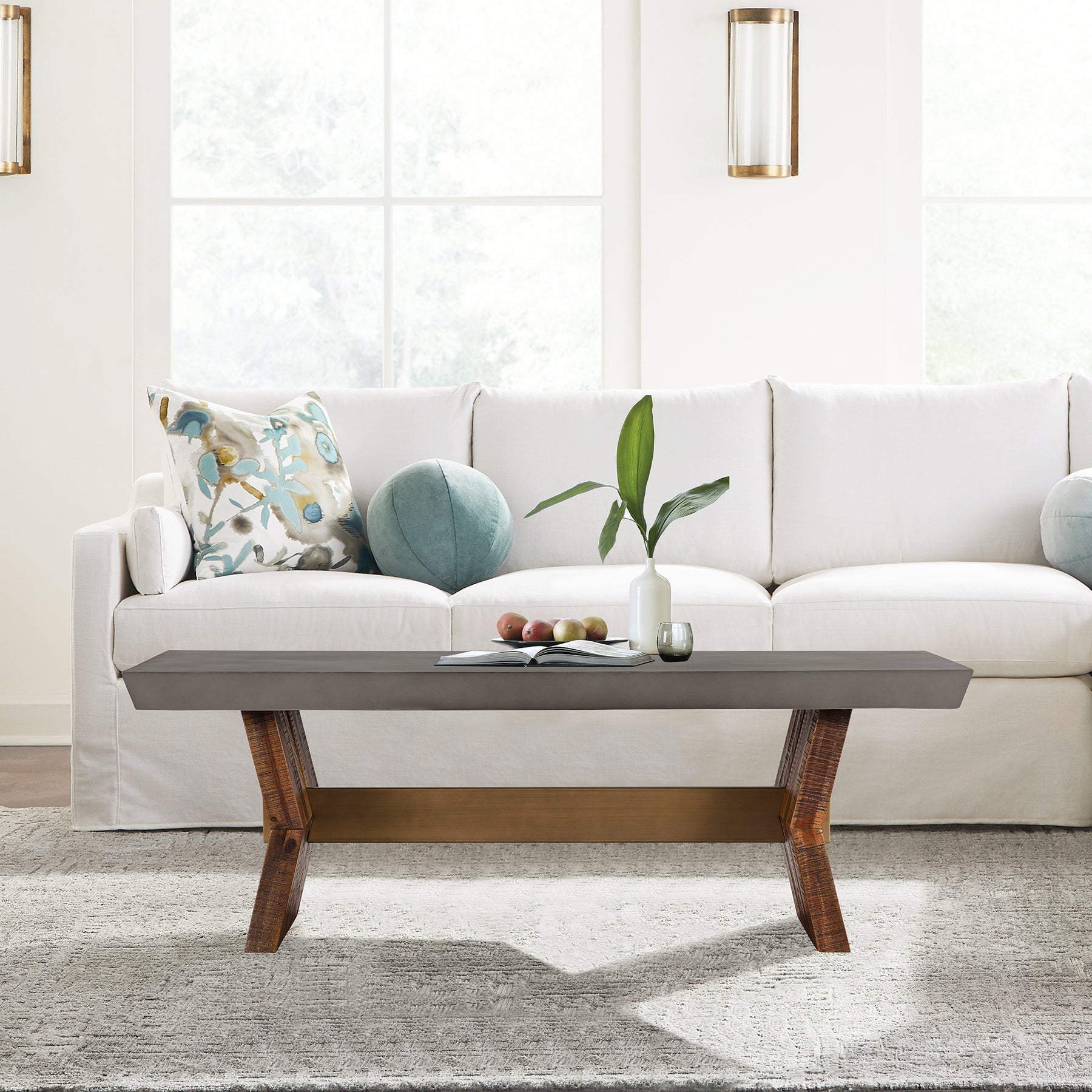 Bring contemporary luxury to your home with our Picadilly rectangular coffee table in acacia wood and concrete. Featuring a sleek concrete top perched upon sculptural acacia legs, our coffee table is sure to make a powerful statement. The lively organic grains and tonal variation of acacia create an eye-catching contrast with antique brass. Featuring a harmonious pairing of the finest materials, our coffee table is sure to bring a dose of elegance to your home. Acacia is the hardest of all hardwoods, characterized by high density and resilience. It is resistant to rot, weatherproof, and immune to fungi and insects. From being the perfect way to elevate your centerpiece to adding a bit of style to your living room, bedroom, or home office, our coffee table is the perfect fit for your contemporary home.