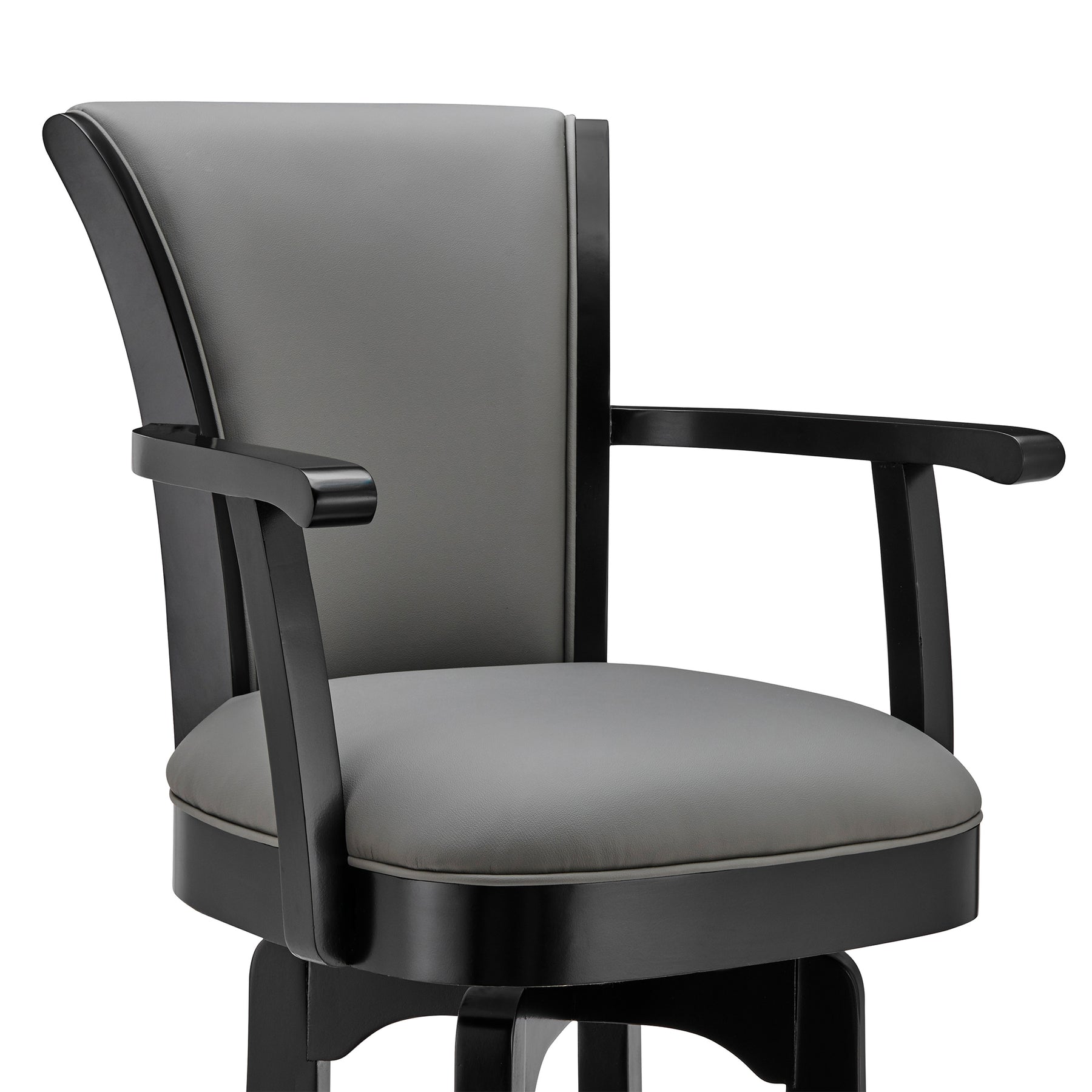 A modern take on a traditional style is the perfect way to upgrade your home or apartment. The Armen Living Raleigh 26" Counter Height Swivel Grey Faux Leather and Black Wood Arm Bar Stool will keep you comfortable for many years to come. The soft faux leather upholstery covers a high-density foam cushion and features a tall back that s ergonomic properties keep your back healthy and properly aligned. The 360-degree swivel function provides your guests with the mobility they need to stay engaged at parties or gatherings and make this stool perfect for entertaining. The Raleigh counter stool has a sturdy 4 leg base that features a round footrest that further accentuates its convenience and works at any surface whether it s in your kitchen, home office, home bar, or den. Arms add to your enjoyment when sitting on the Raleigh stool, especially if you re sitting for a long period of time. The foundation of the product is supported by solid wood for a chic and stylish aesthetic without comprising practicality and functionality of this item. The Raleigh Swivel Bar or Counter stool is available to you in a 26 or 30 seat heigh and comes in your choice of a chestnut wood with kahlua brown faux leather upholstery, or a black wood with grey faux leather upholstery.Product Dimensions