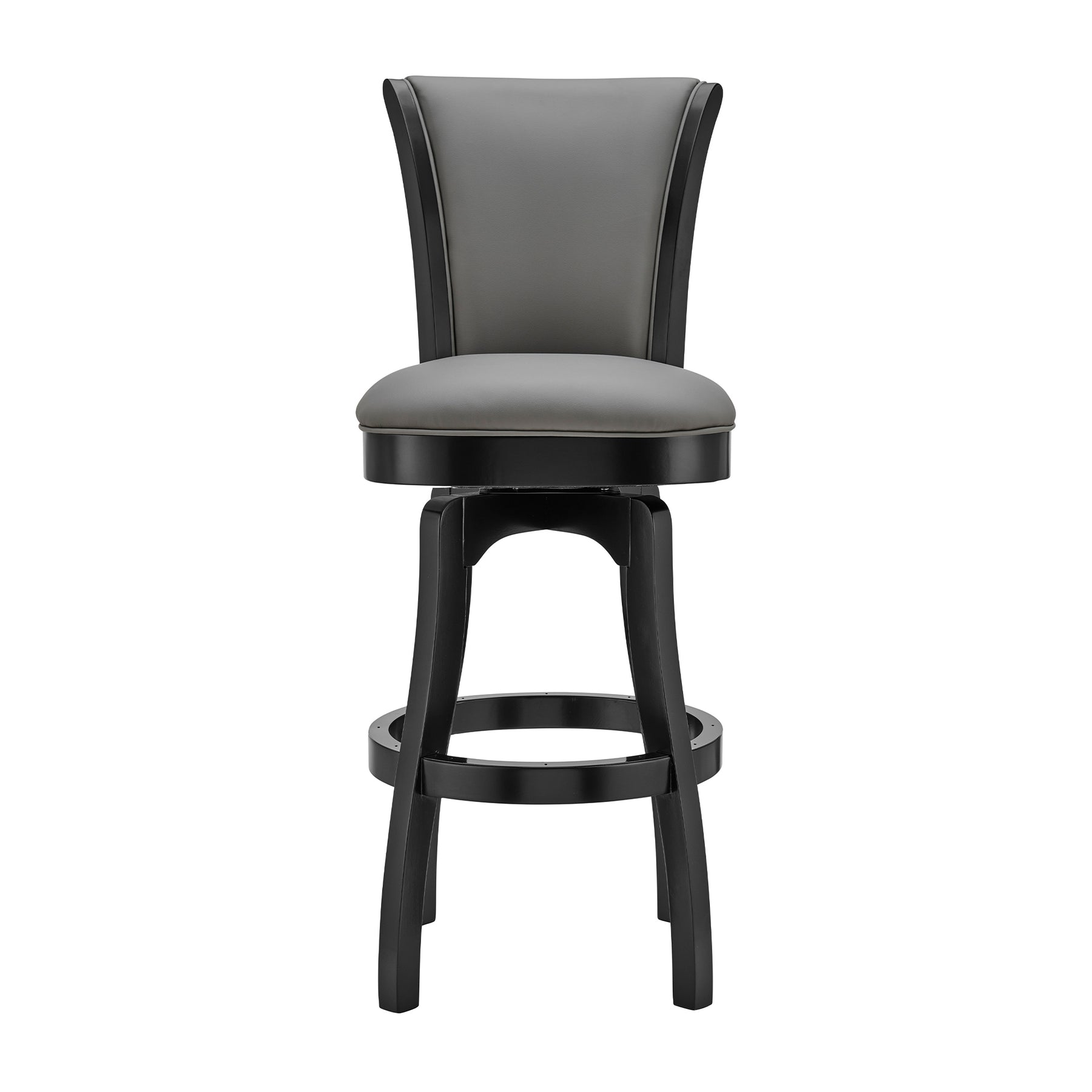 The Armen Living Raleigh rustic armless swivel barstool is a beautiful addition to the contemporary kitchen counter or bar. This elegant barstool features solid wood construction, and a plush faux leather upholstered seat and back. The Raleigh barstool features a 360-swivel function and footrest, allows for optimal user mobility. Ideal for the modern home, this barstool is sure to enhance your dwelling. The plush padded seat with high density foam will provide you with all day comfort. The solid wood back is ideal for posture alignment and an unmatched support for days on end. The foundation of the product is supported by solid wood for a chic and stylish aesthetic without comprising practicality and functionality of this item. This product ships in one box with easy and quick set up. We stand by the quality, the craftsmanship and the integrity of our product by offer 1-year warranty for all our products. We want our customers enjoy our product and we will always be there to help with our top-notch customer service support. The Raleigh Collection is available in a 26" counter or 30" bar height, available with or with out arms. Also available in chestnut faux leather with Kahlua finish, or gray faux leather with black finish.Product Dimensions