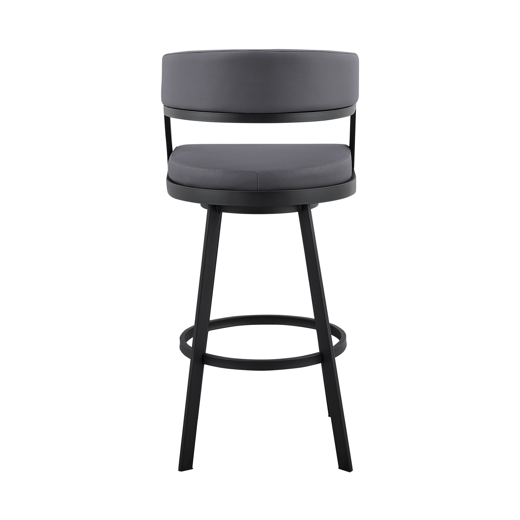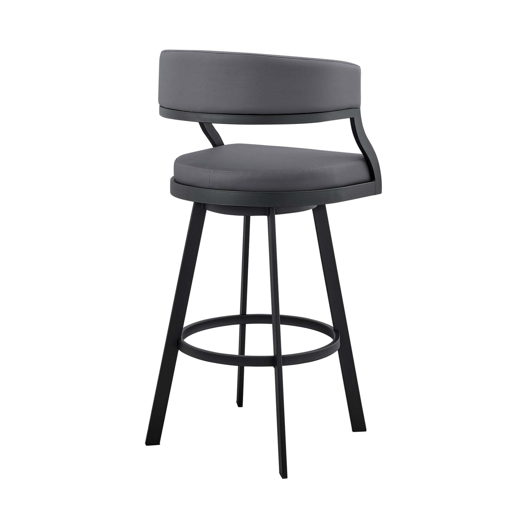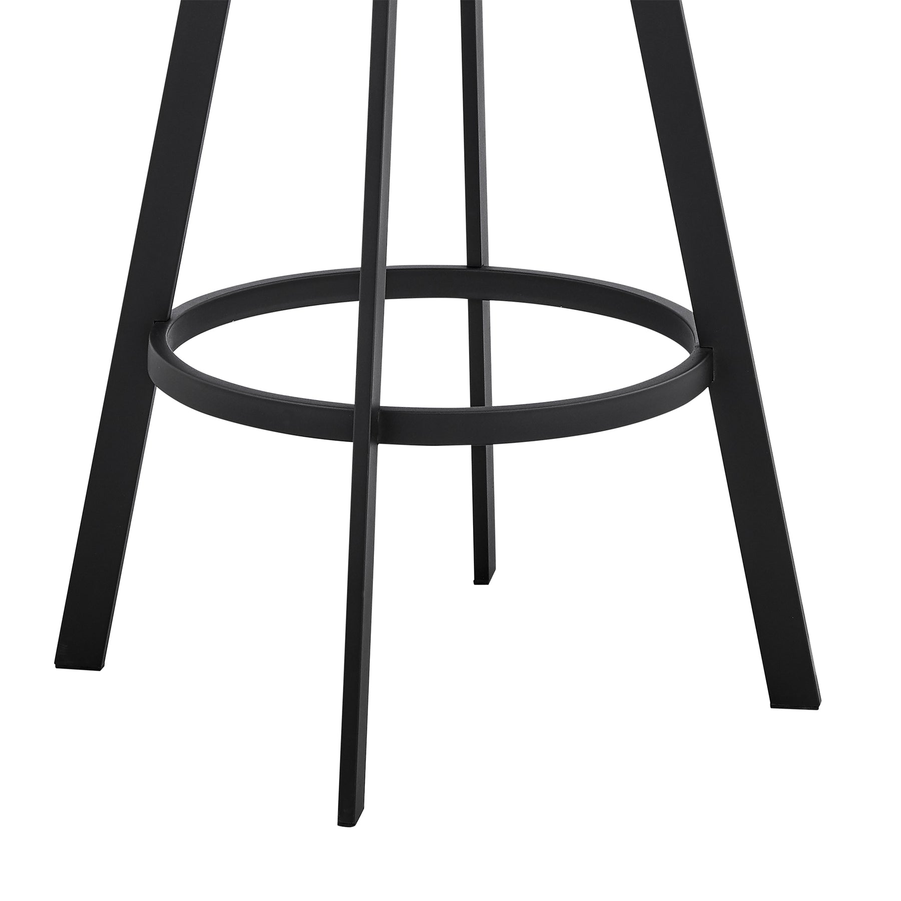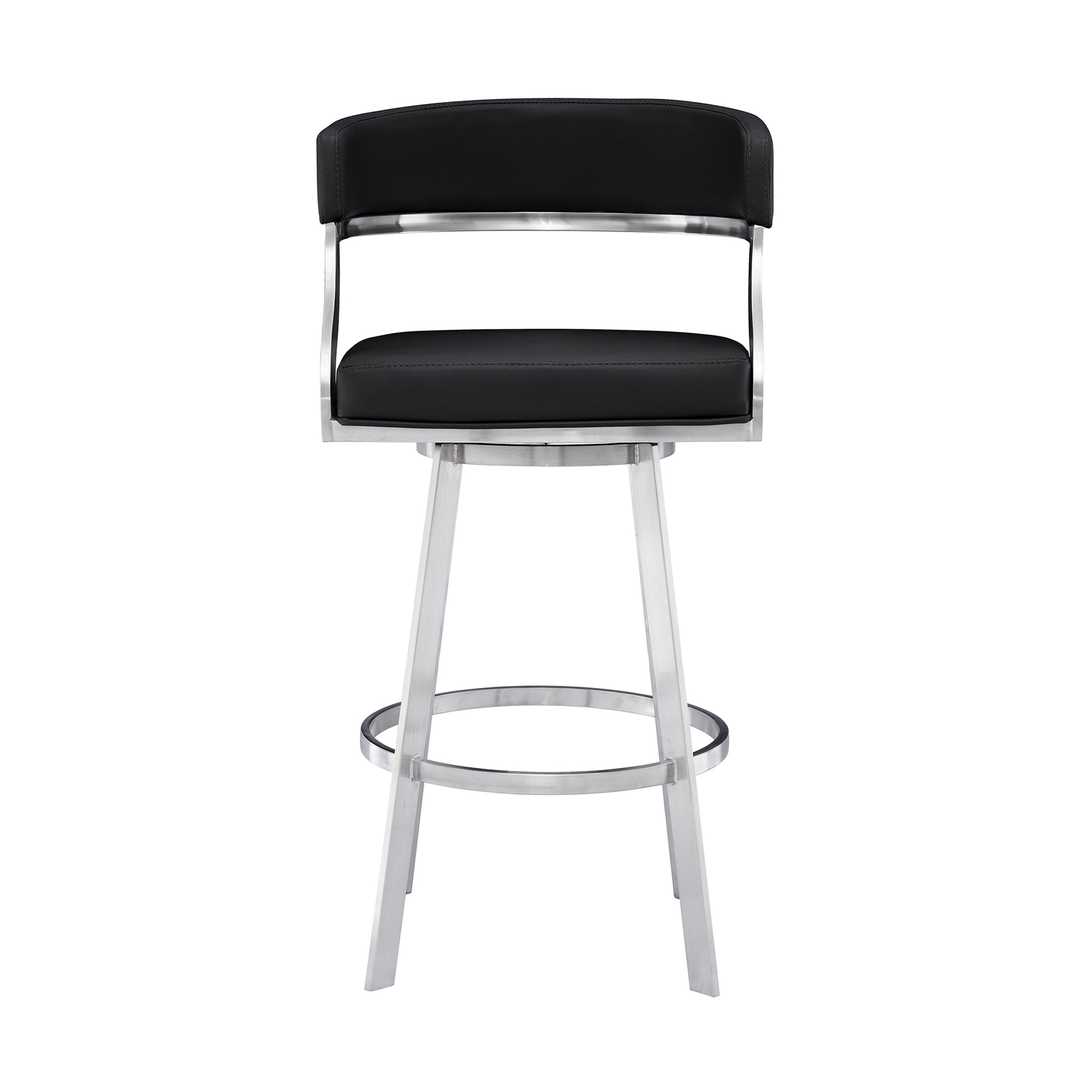 The Saturn 26" Counter Height Swivel Black Faux Leather and Brushed Stainless Steel Bar Stool from Armen Living is a unique addition to any home or apartment. The Saturns soft faux leather upholstery is wrapped around a high-density cushion that cover the back and seat of the kitchen stool, providing you with optimal comfort. The 360-degree swivel motion allows your guests to stay engaged at parties or gatherings regardless of their place in the room, making this the perfect stool for entertaining! The Saturn is ideal for any room in your house, such as your kitchen, office, home bar, or den due to the availability of 2 seat height options. The open seat back provides breathable seating and allows for easy movement around your home. The sturdy frame consists of a 4 leg-base that includes a ring footrest and floor protectors, ensuring the Saturn will not damage your floors, further accentuating its convenience. The Saturn Bar or Counter Stool is available in a brushed stainless-steel finish with gray or black faux leather, an auburn bay metal finish with brown faux leather, or a mineral metal finish with vintage black faux leather upholstery. .