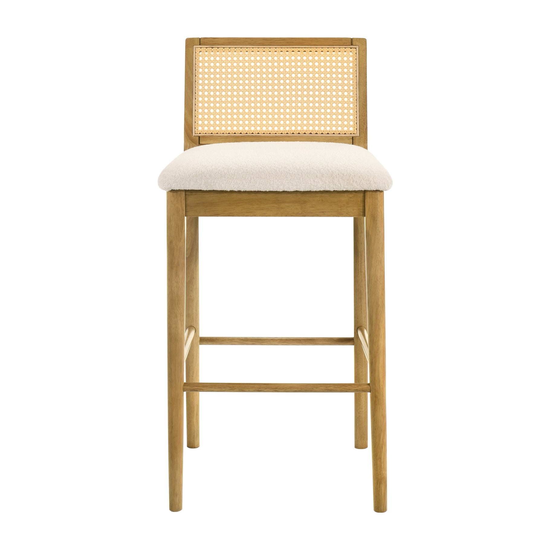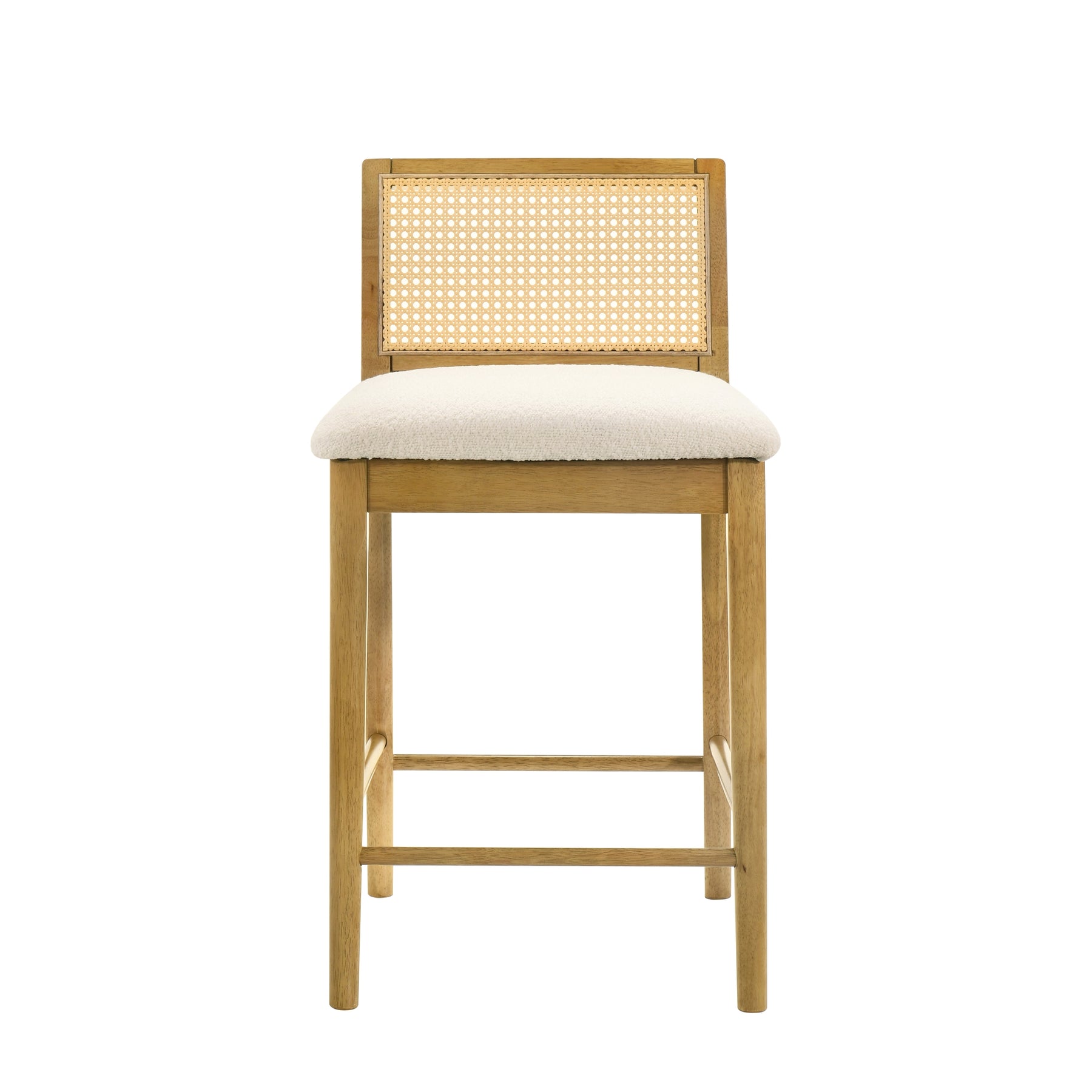 The Tobias Barstool Collection captures the perfect balance of craftsmanship, comfort, and modern design with a natural touch. It stands out through its distinctive woven rattan backrest, paired with a plush white boucle seat,a timeless combination that blends texture, warmth, and contemporary refinement. Designed for modern homes that appreciate natural materials, Tobias offers both visual charm and enduring comfort. Crafted from durable solid natural wood, the frame showcases clean lines and soft edges, giving the stool a balanced silhouette that works effortlessly in kitchens, dining areas, and home bars. Two elegant finish options , Amber Glow, with its golden undertones, and Black, for a bold modern contrast , complement the boucle upholstery beautifully. Each stool feels inviting yet elevated, suitable for both casual breakfasts and evening gatherings. The seat, upholstered in white boucle performance fabric, delivers a tactile softness while maintaining durability against everyday wear. It s designed to resist stains, moisture, and fading, making it perfect for active households. Beneath the seat, a sturdy support frame ensures stability, while the integrated footrest promotes ergonomic comfort during long conversations or meals. The slim, armless profile allows for space-saving versatility , easy to tuck under countertops when not in use. Available in both counter height and bar height, Tobias adapts to various setups with timeless appeal. The rattan backrest introduces a natural airiness and visual lightness, its gentle curve providing subtle back support without overpowering the silhouette. Combined with the inviting texture of the boucle fabric, the result is a piece that feels both grounded and refined , a stool that fits as easily in coastal interiors as in urban lofts. Assembly is simple, requiring minimal effort, with all components and hardware included. Supported by a 1-year limited manufacturer warranty, Tobias offers long-lasting quality and style that endures trends and time alike.Product Dimensions