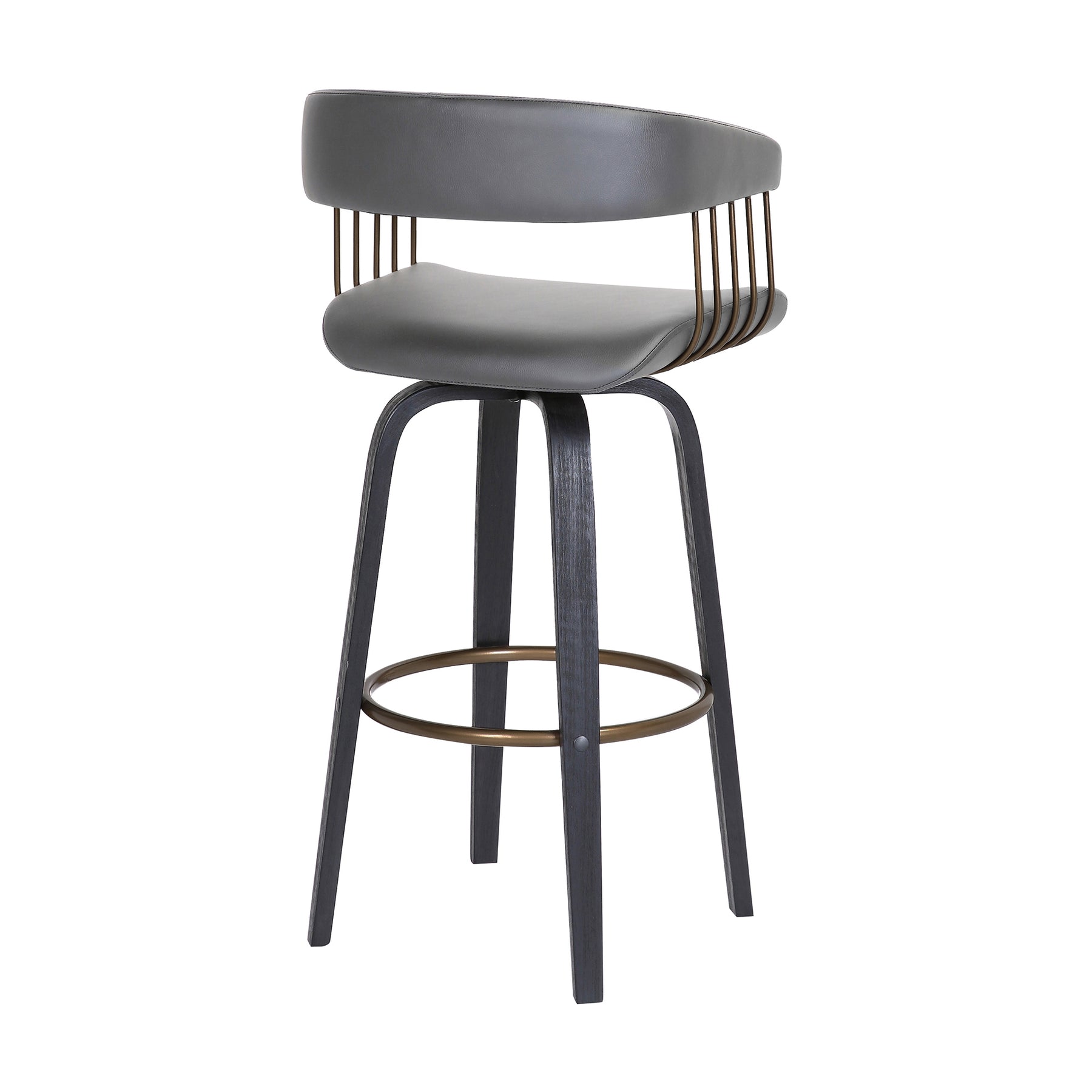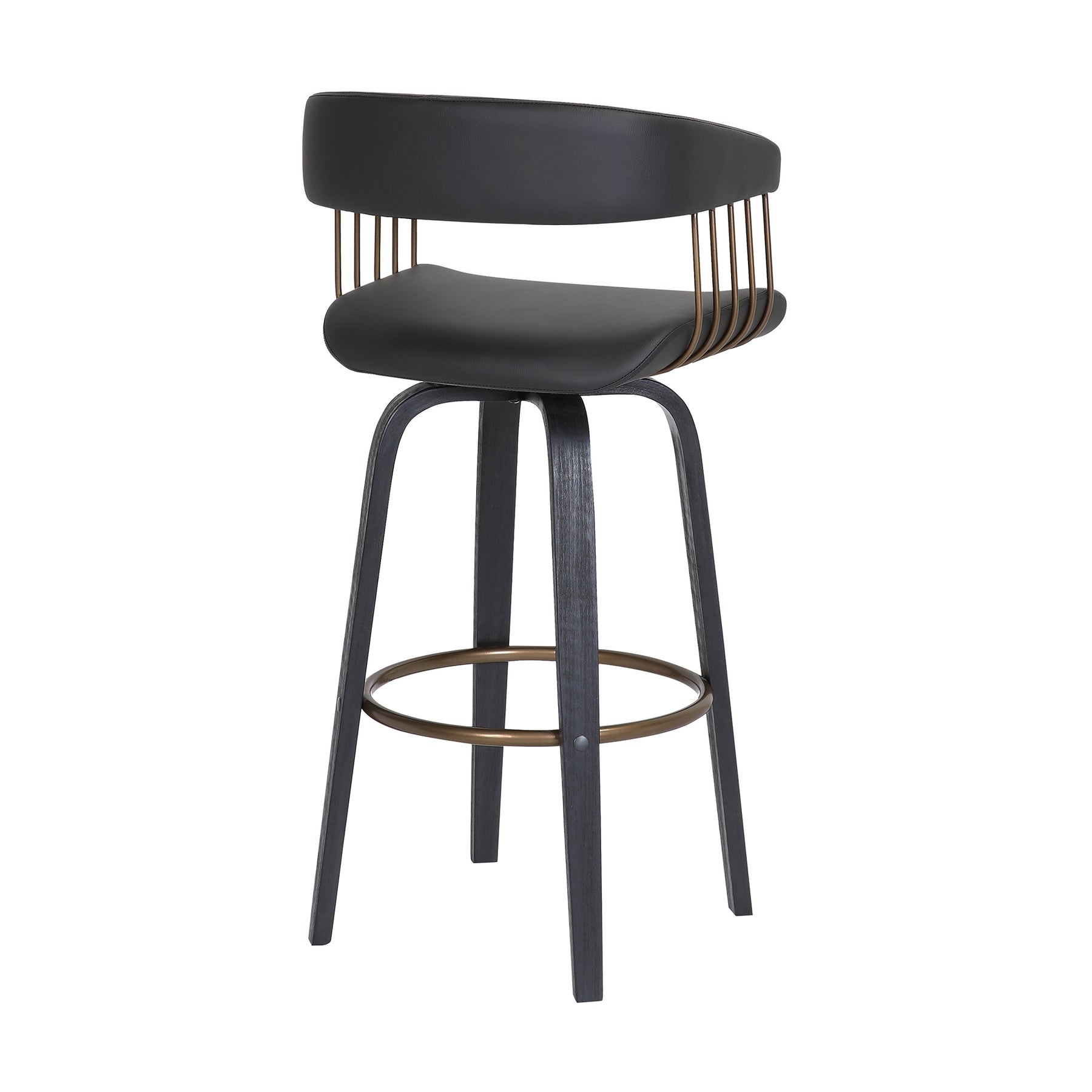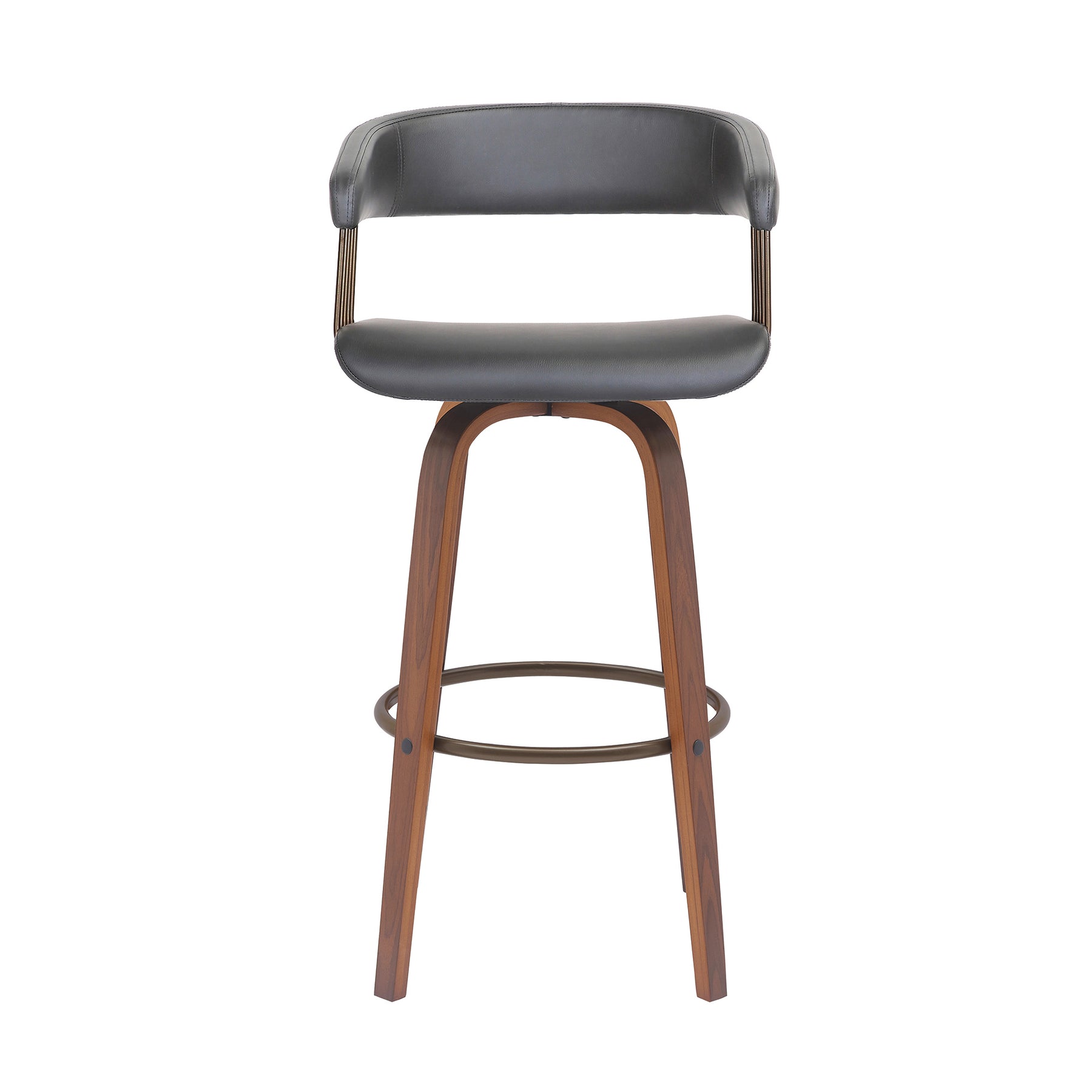 Bring refined style and sophistication to your bar or high dining table with our Topanga upholstered bar or counter stool. A beautifully curved back and seat are held together with a crisp and clean-lined frame to make a statement in any corner. Its hugging barrel back and contoured seat is generously padded to offer sink-in comfort. Complemented with sculptural bentwood legs and a metal footrest, our bar stool blends eye-catching style with a dose of comfort and functionality. It is upholstered in faux leather which does not crack or fade easily; the material is both stain and UV resistant for easy maintenance and longevity. Expertly crafted from engineered wood and metal, our contemporary bar stool remains a rich blend of materials and finishes, bringing luxury and sophistication anywhere from your kitchen to a home office. It remains the perfect complement to a kitchen island, pub table, home bar, or adjustable desk. For supreme functionality, the counter stool is fitted with a wonderful 360-degree swivel function, allowing you to join conversations and work with efficiency and ease. The Topanga swivel bar or counter stool easily incorporates into any home and is available in your choice of 26-inch or 30.5 -inch seat height in a walnut wood and golden bronze finish with cream or grey faux leather, or a black and golden bronze finish with your choice of grey or black faux leather upholstery.Product Dimensions