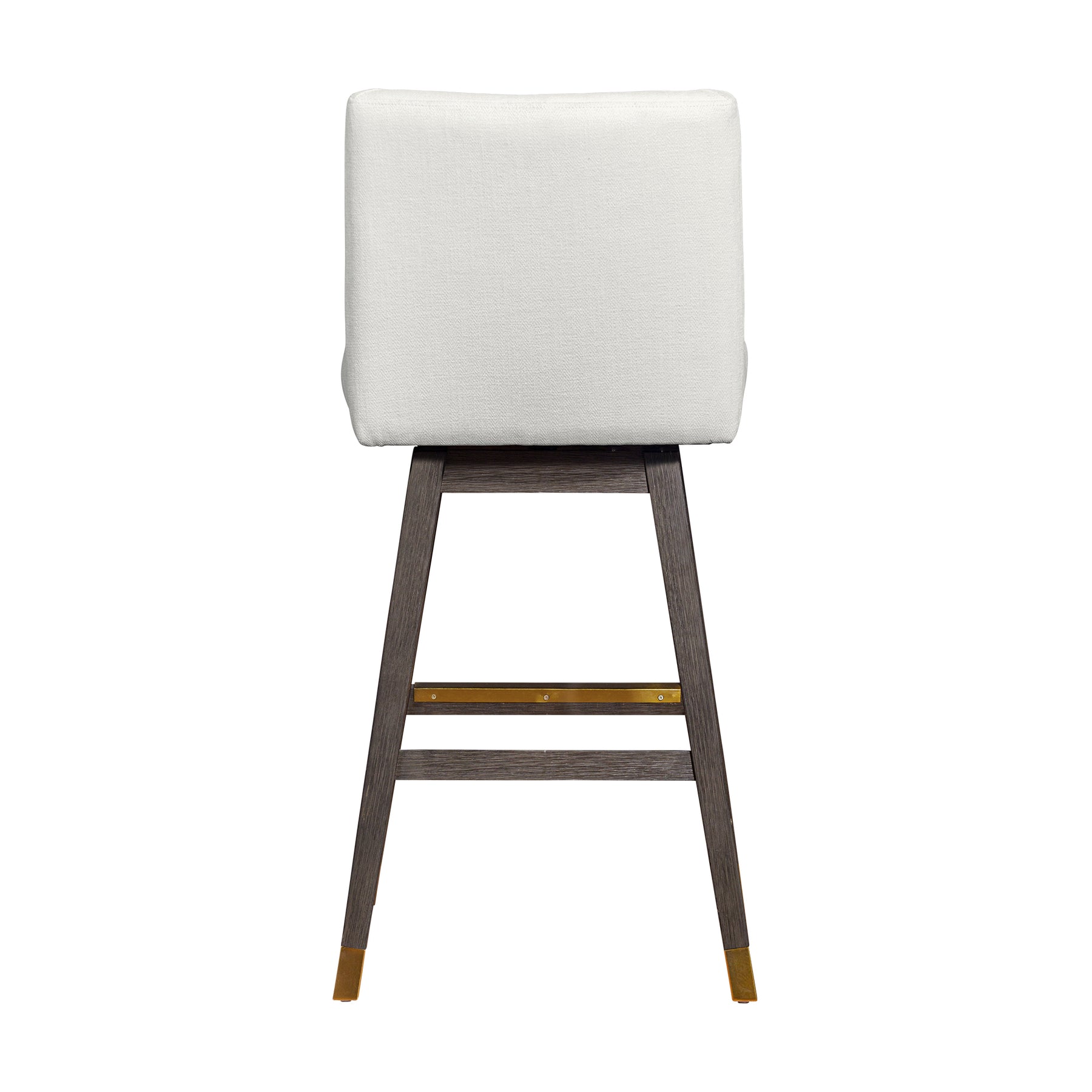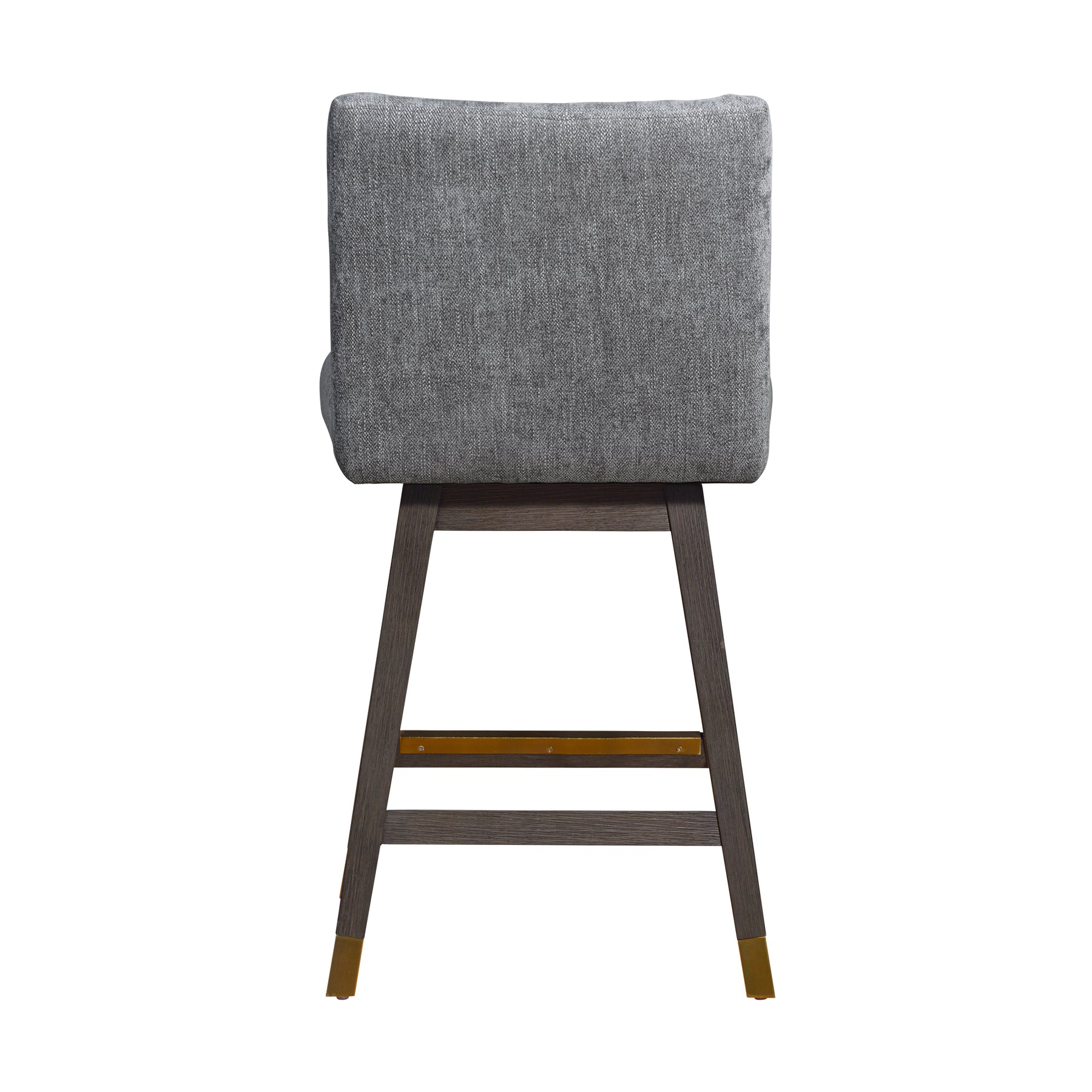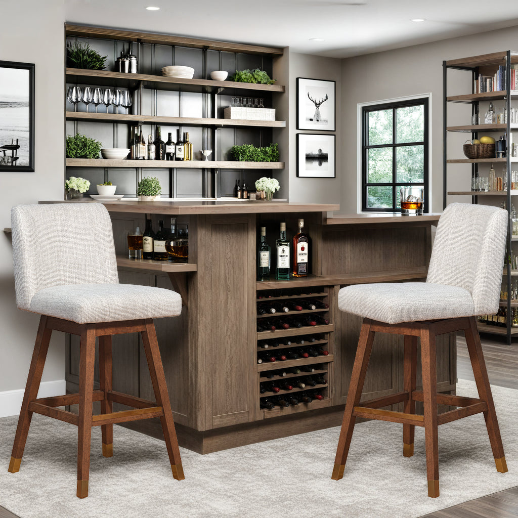 Modern design collides with high quality materials and creates a functional work of art that is the Isabella Swivel Bar or Counter Stool in Wood with Fabric Upholstery. The Isabella swivel bar stool comes as a welcome addition whether you re furnishing a new place or updating your kitchen or dining space for a fresh new look. Entertaining is a breeze with the swivel mechanism. The 360-degree memory swivel or ‘spin-back seat allows you to swivel either way and the seat always returns to forward facing position when you stand up. The sturdy 4 leg base is constructed from rubberwood. Rubberwood is a durable hardwood belonging to the maple family. Its dense grain character makes it a stable construction material that is naturally resistant to fungus and bacteria. The wood base is further complimented by the soft upholstery. The long-term durability of polyester makes it an ideal choice of stool upholstery fabric for families with children and pets. Polyester upholstery is water repellent, stain resistant, budget friendly, and less prone to discoloration. The combined features of the Isabella counter or bar height stools make for an easy choice! This modern bar stool is available in your choice of a 26 inch or 30 inch seat height and comes in a brown oak wood finish with beige or taupe fabric, or a grey oak wood finish with grey or pearl fabric upholstery.