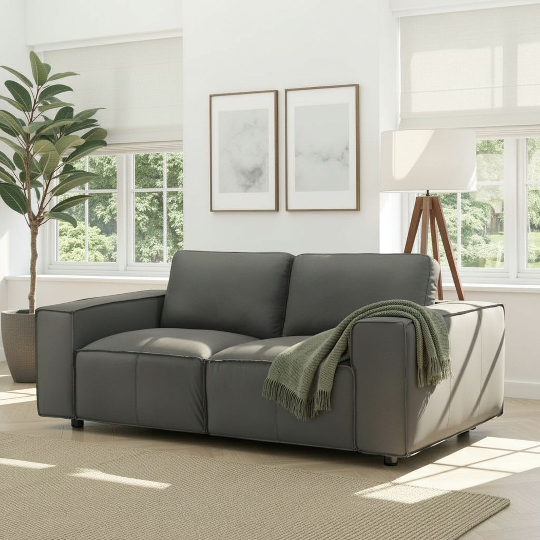 Elevate your living room with the Clayton 76 in. Modern Top-Grain Genuine Leather Loveseat, available in Anthracite Gray or Ochre. Designed with sleek lines, modern track arms, and a low-profile silhouette, this loveseat strikes the perfect balance between contemporary style and everyday comfort. Its versatile design makes it a standout piece in both modern and transitional spaces, giving you the freedom to design your living room around your unique taste. Crafted with high-quality leather upholstery, the Clayton loveseat offers a luxurious look and feel while being durable enough for daily use. The Anthracite Gray option provides a bold, modern statement that pairs beautifully with industrial and minimalist decors, while the Ochre color adds a touch of warmth and richness, perfect for cozy, sophisticated interiors. Whichever you choose, the leather surface is smooth, easy to maintain, and built to last season after season. Comfort is at the heart of the Clayton loveseat. With plush, supportive cushions and a wide 76-inch frame, it provides ample space for two to sit comfortably. Whether you’re enjoying a quiet evening with a book, hosting guests, or creating a cozy movie-night spot, the Clayton loveseat delivers reliable comfort without sacrificing style. Its tailored cushions retain their shape while offering the sink-in comfort you expect from a high-quality seating piece. Built on a sturdy wooden frame, this loveseat is designed for long-term durability. The streamlined legs add subtle support while keeping the focus on the bold, boxy silhouette. Plus, because assembly is minimal, setup is simple and fast, so you can get straight to the good part: enjoying your space. Pair it with the coordinating Clayton sofa for a complete set, or let it shine as a standalone statement piece. Whether in Anthracite Gray for a sleek, modern edge or Ochre for a warm, inviting vibe, the Clayton loveseat adds style, durability, and comfort to your living space.Product Dimensions