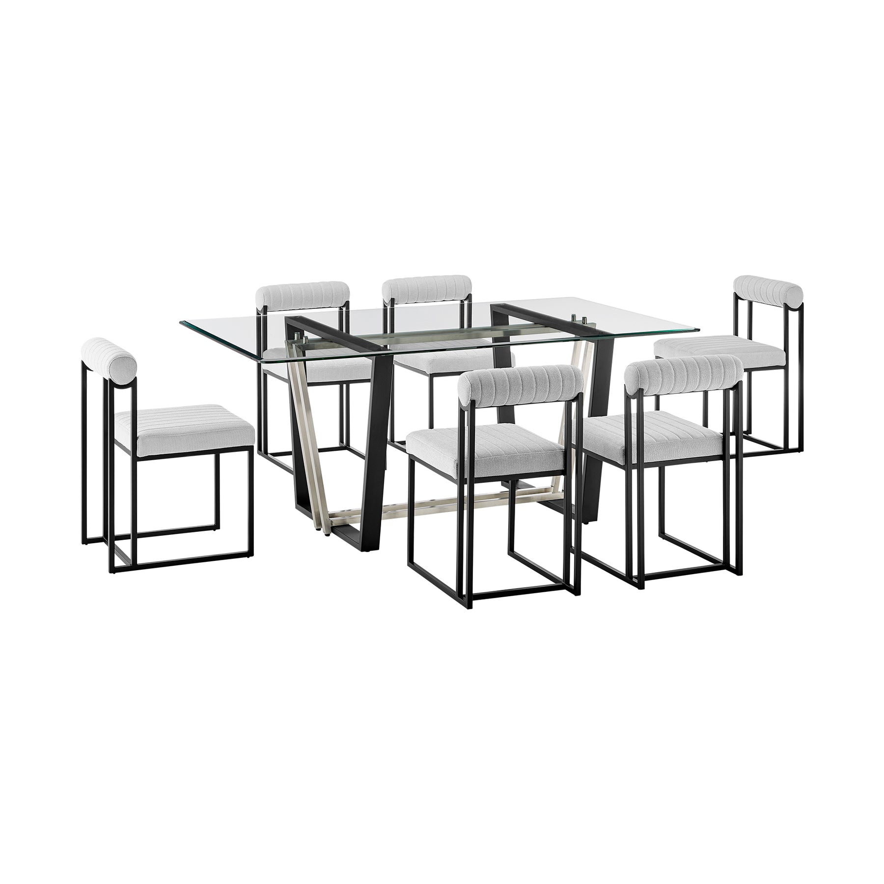 Give a sophisticated upgrade to your dining area with the Kai Anastasia Dining Set by Armen Living. This set includes 1 Kai Rectangular Glass Dining Table with Metal base and 6 Anastasia Upholstered Dining Chairs. The crisp and clean-lined design of our dining set offers modern drama and elegance. The rectangular, glass tabletop beautifully balances on a streamlined metal base. The sharp angles and contrasting finishes lend a touch of polish and definition to our dining table. It serves as a brilliant complement to our Anastasia dining chairs. The Anastasia's cushioned backrest and padded seat showcase a neat channeling detail that provides texture for a chic and inviting look. Creating a beautiful contrast with the sleek frame and comfortable cushions, these dining chairs are set to make a stylish impact. The chair is upholstered in performance fabric or smooth faux leather to offer easy care and maintenance. Together, this dining set can bring an elevated tone to your kitchen, dining room, or living space. It serves as the perfect spot to enjoy dinners, engaging conversations, and activities. With sturdy construction and high-quality materials, our dining set will continue to bring style and comfort to your home. The Kai Anastasia 7 Piece Rectangular Glass Dining Table Set is available in matching finishes and a variety of colors, or sold separately to achieve any look you desire..