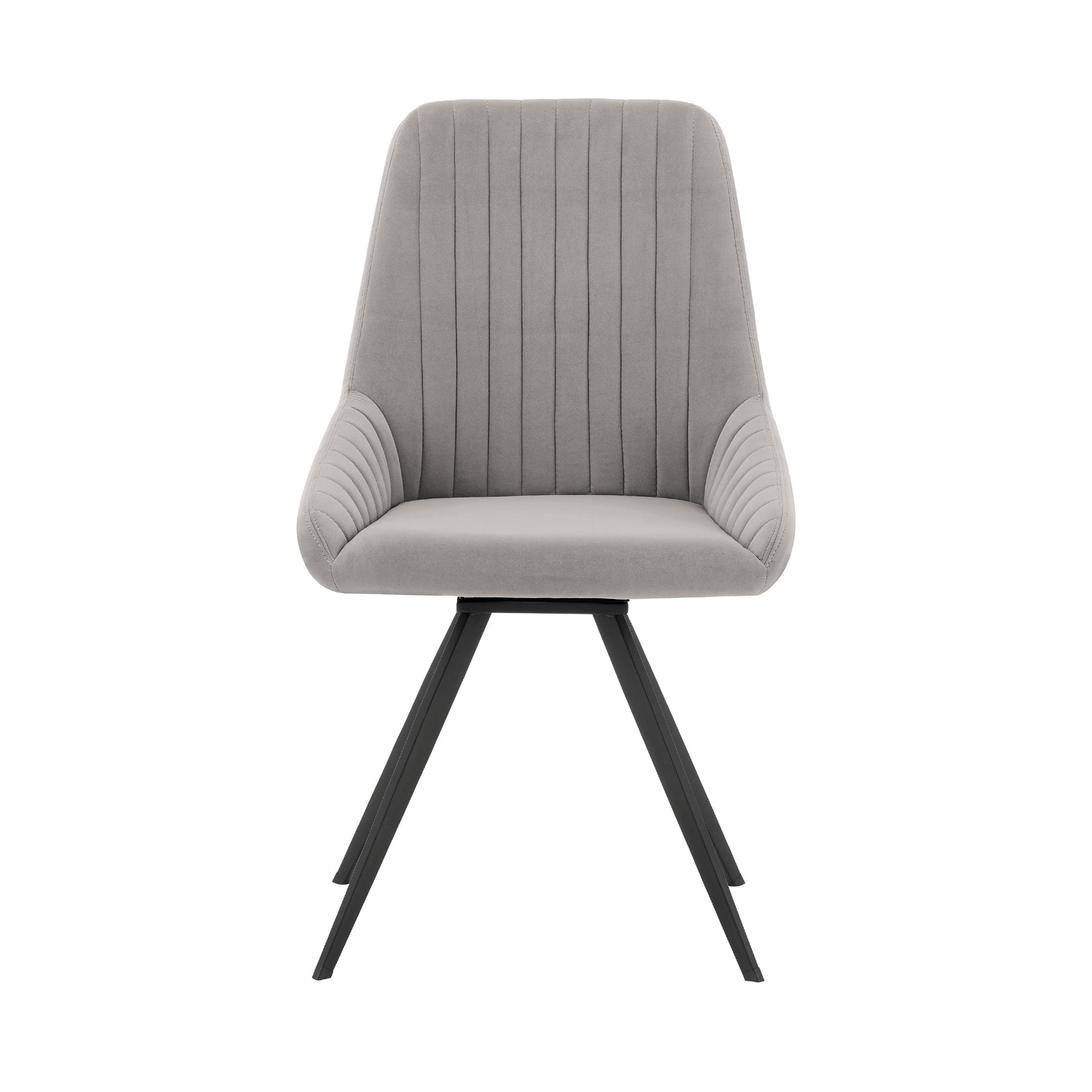 Enjoy an intimate meal or host a dinner party with the Knox Alison 5 Piece Dining Set with Stone Top and Grey Velvet Chairs. This set includes 1 Knox dining table and 4 Alison swivel dining chairs. Beautifully minimalistic, our dining chair stands out with a refined and striking silhouette. The clean geometric upholstered lines add a textured look to these chairs. The back and seat are both generously padded to bring a dose of comfort to your formal and casual meals. Our dining room chair can also serve as a comfy seat in your home office or provide a comfortable spot to relax in your living room. The dining table chair also includes a 360 degree swivel function allowing you to change directions and follow conversations with ultimate ease. It is upholstered in performance fabric for easy care and maintenance. The refined and distinctive silhouette of the dining table attains a statement-making appeal in any room. It features a perfectly rounded tabletop perched upon an eye-catching pedestal base. Its stone tabletop depicts the graceful and natural textures of white marble to add a polished touch to your casual or formal meals. It is perched upon a black metal base to attain contrast and a versatile appeal. The round dining table can comfortably seat up to six individuals for enjoying meals in your kitchen, dining room, or living space. A 55 round shape allows the table to function as a natural hub for conversations. The Knox Alison dining set is available as a 5-piece set and features a white stone tabletop with black metal base and grey velvet upholstered swivel dining chairs.Product Dimensions