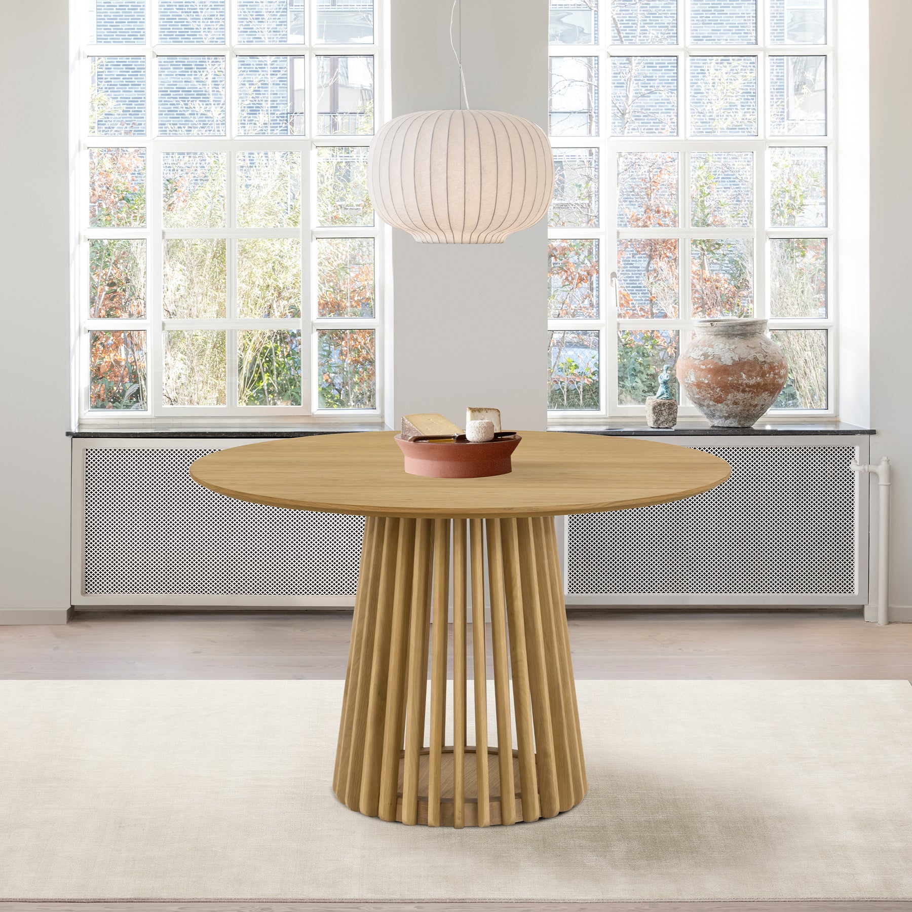 Introducing the Pasadena 47" Wood Round Dining Table, a chic and versatile addition that effortlessly blends style and functionality into your indoor living spaces. Finished in a sophisticated Natural Oak, this contemporary dining table is designed to make a statement in both dining rooms and kitchens. Crafted with meticulous attention to detail, the round shape of the table adds a touch of modern elegance to any space. The compact 47-inch size makes it an ideal choice for those seeking a small dining table without compromising on style. Its versatility extends beyond the dining room, seamlessly integrating into kitchens as a modern kitchen table. The Natural Oak Finish not only adds a layer of refinement but also ensures that this dining room table complements a variety of interior styles. The rich color enhances the contemporary aesthetic, creating a focal point that invites gathering and conversation. Perfect for intimate dinners or casual family meals, the Pasadena dining table is designed for those who appreciate a blend of form and function. The thoughtfully crafted piece is a testament to modern living, where style meets practicality in a seamless fusion. Elevate your dining experience with the Pasadena 47" Wood Round Dining Table, where contemporary design and a compact footprint come together to enhance your indoor spaces.Product Dimensions