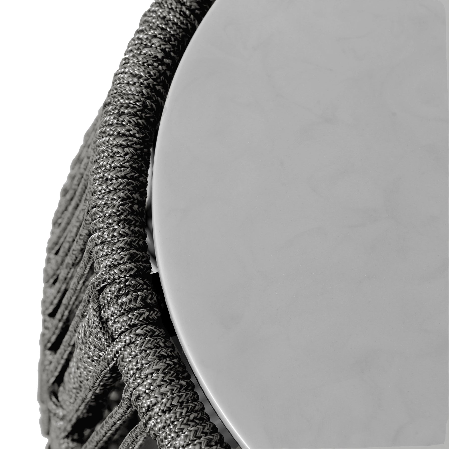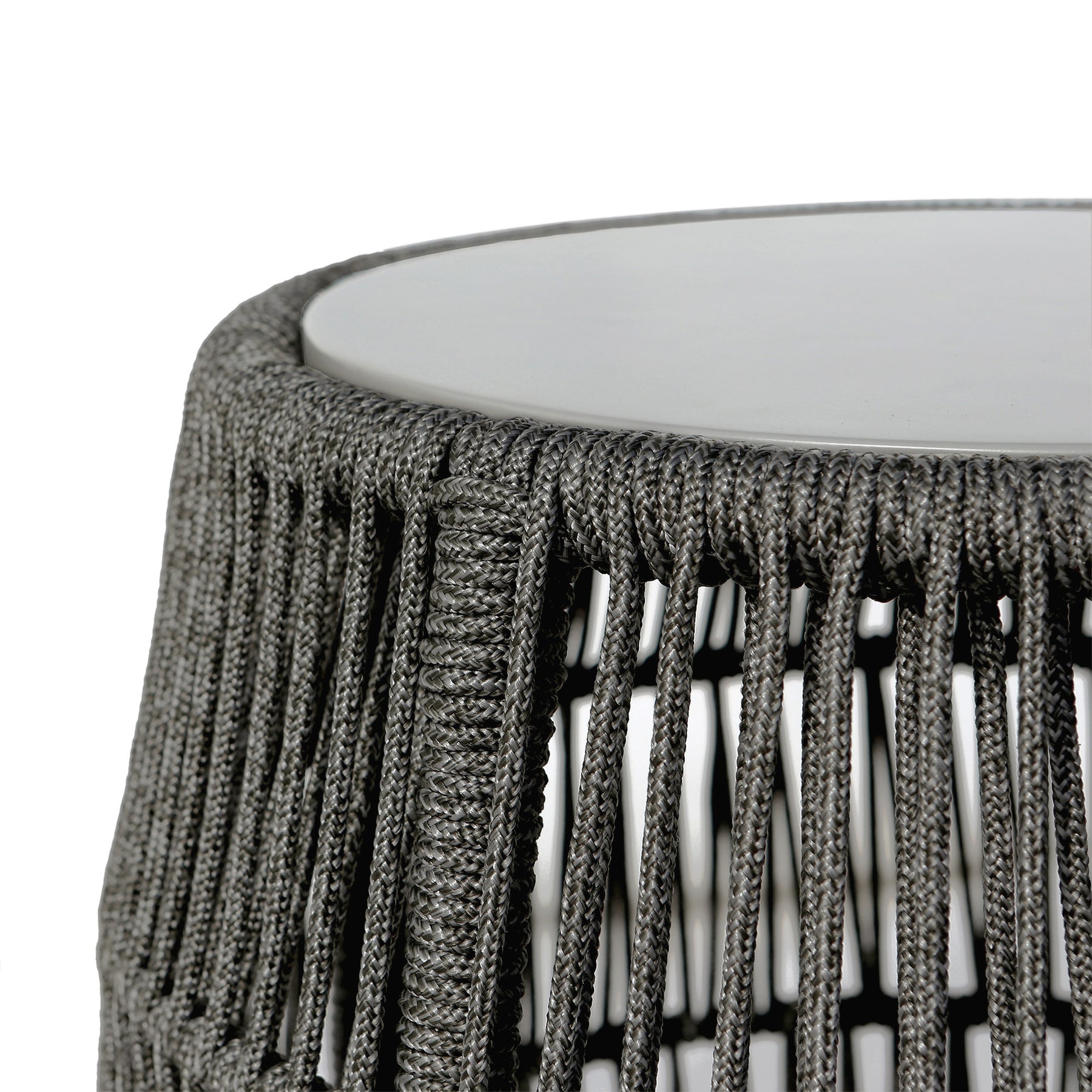 Enjoy the endless applications of the Opus Garden Stool End Table from Armen Living. Constructed from steel, wrapped in resilient and weather resistant rope and topped with smooth Superstone top, that is both stylish and functional.. Superstone tops epitomize quality outdoor furniture, merging stone-like elegance with the convenience of a lightweight composite. With a smooth stone surface that is durable and robust and capable of withstanding inclement weather and everyday wear and tear. Consisting of two layers of cement fiberboard encasing an aluminum honeycomb core, topped with a high-performance UV topcoat and natural mineral granules for an attractive, long-lasting finish. The Opus’ steel frame is incredibly durable as steel does not dent or get bent out of shape as easily as some aluminum furnishings can. Lighter than wrought iron but heavier than aluminum, steel provides strength, stability, and endurance in extreme temperatures. This garden stool can be used universally around your home, as a plant stand, bedside nightstand, living room accent table, or end table. The applications are endless, and the style is timeless. The Opus garden stool is available in your choice of grey or charcoal rope, with a Grey Superstone top.