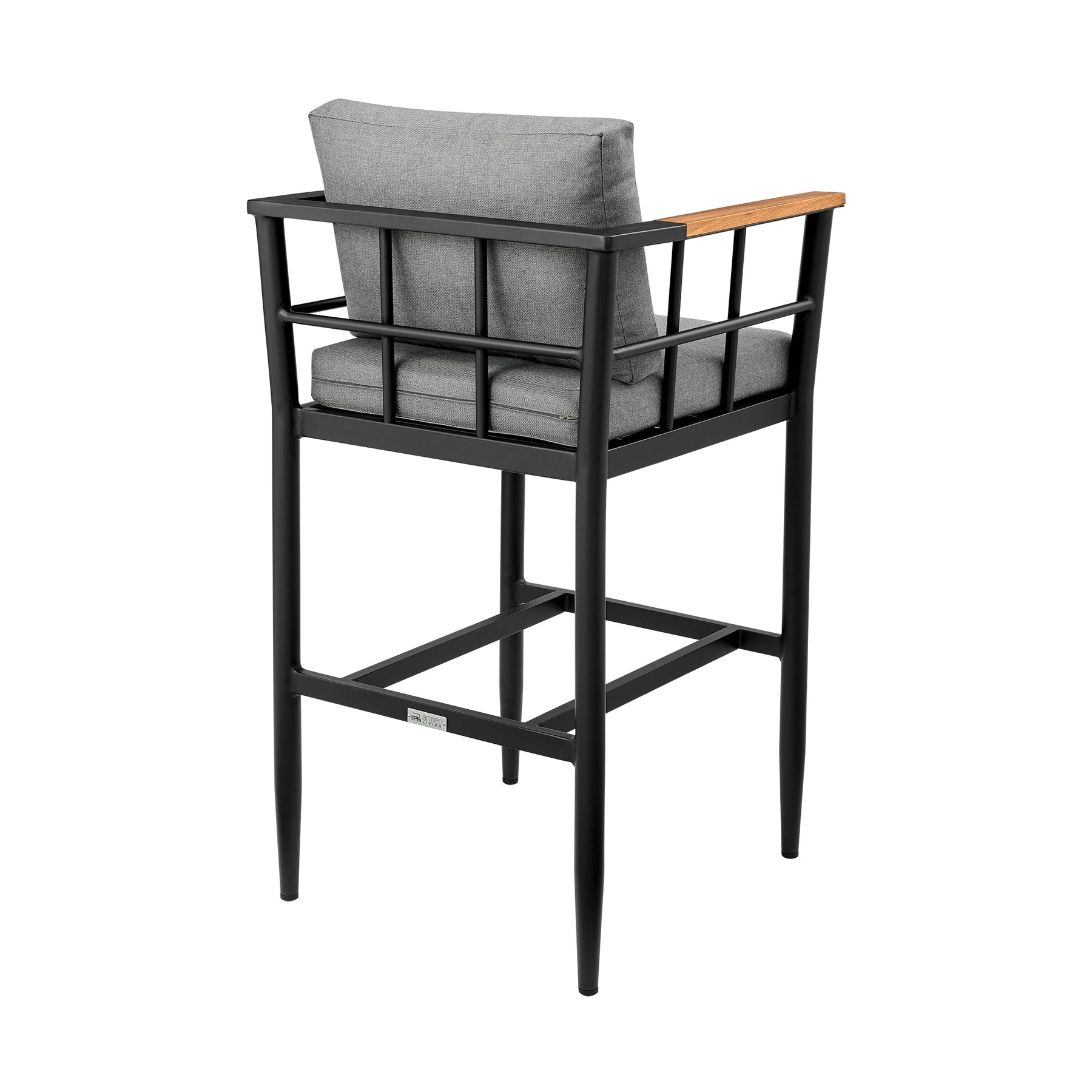 Add a touch of modern beauty to your indoor or outdoor space with the Orlando Patio Aluminum and Teak Bar or Counter stools from Armen Living. Featuring a geometric barrel style design that provides ergonomic properties to keep your back properly aligned, the Orlando is a true work of art. The teak accents on the arms give the stool a warm touch, strong and durable, teak can last for generations in a wide variety of climates with zero maintenance. This is due to the high rubber and oil content of the wood that leave it impervious to rain, weather, and pests, making it virtually immune to rot. This bar stool with back includes plush dark grey high density foam cushions to offer a wonderfully comfortable sitting experience. The cushions for this bar stool also feature a zipper closure that allows for easy removal and cleaning! Featuring an inviting and versatile design, the barstool sits easily in any outdoor setting. Made up of lightweight and durable aluminum framework, the Orlando stool is easily portable and features a multi-layer powder coating for further effective protection from the elements, UV, rust, and everyday wear and tear. This is a perfect metal barstool to use indoors and is treated to withstand being outdoors. The Orlando outdoor bar stool is a unique addition to any backyard, garden, pool area, or screened in porch! It’s available with a black powder coated finish and features beautiful natural teak accents and dark grey upholstery. Available in your choice of a 26†or 30†seat height, the Orlando can support up to 250 lbs per seat.Product Dimensions