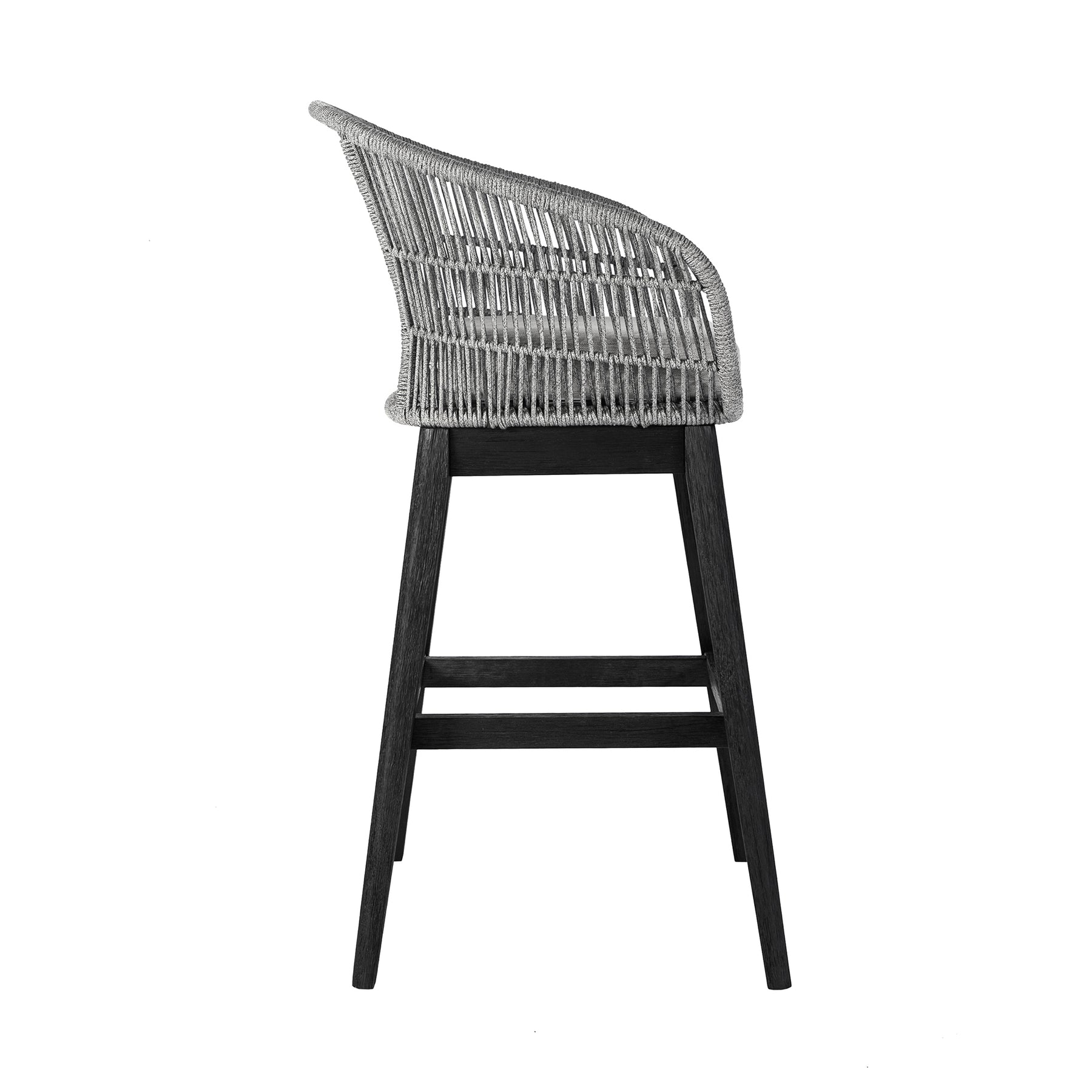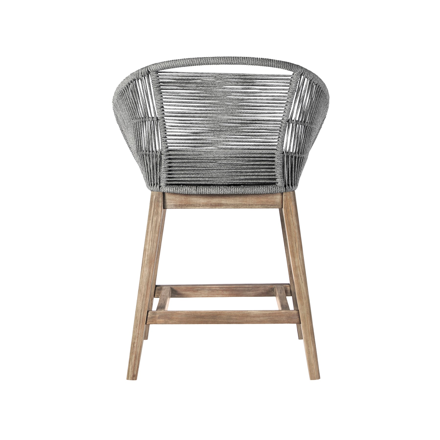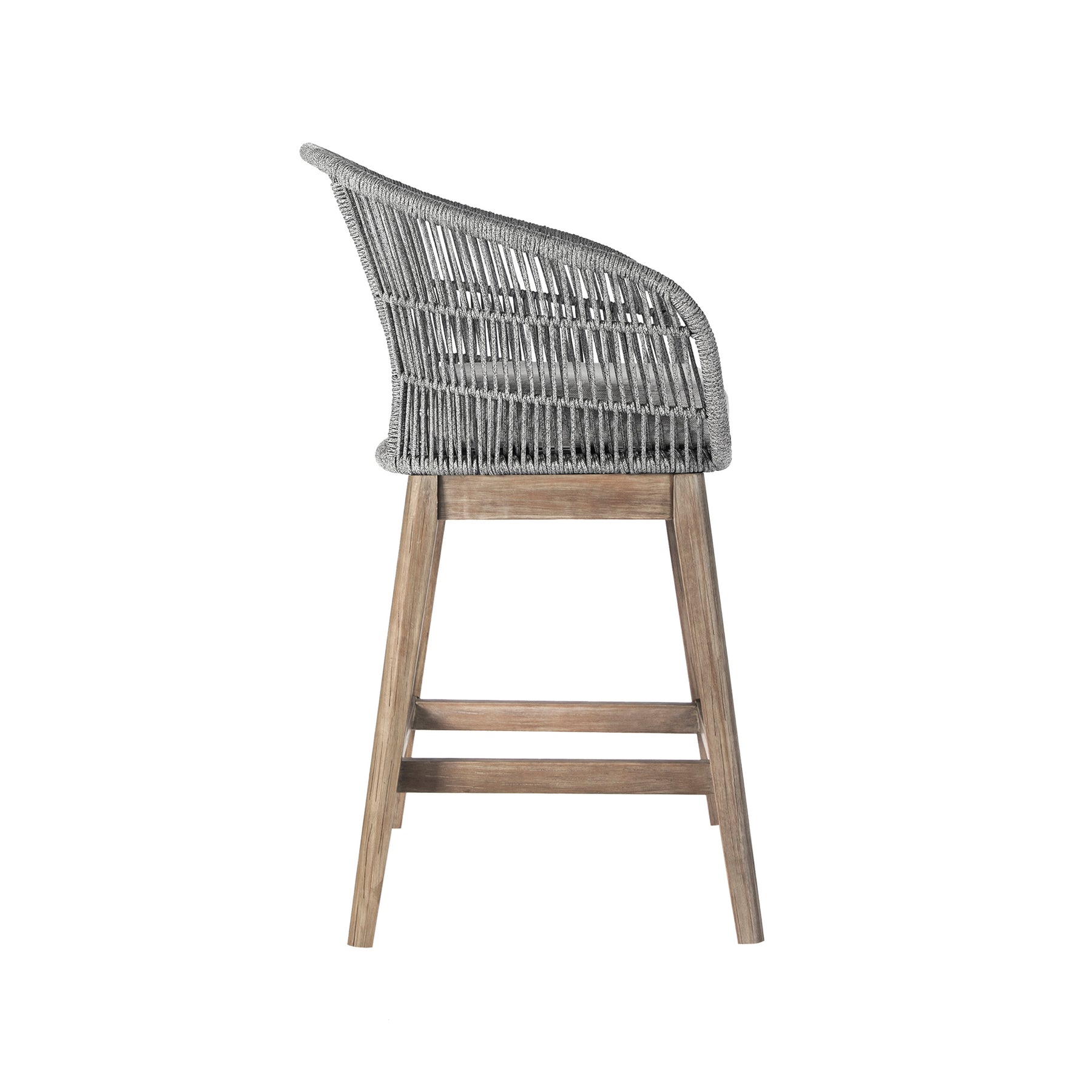 The Tutti Frutti Indoor Outdoor Bar or Counter Height Bar Stool in Wood with Gray Rope from Armen Living is the quintessential choice of an outdoor bar stool that will give your indoor or outdoor living area a whole new aesthetic and presentation for you to enjoy. Featuring a eucalyptus wood base, the Tutti Frutti is durable and highly weather-resistant giving you years of extra enjoyment thanks to the longevity of these chairs. The incredibly comfortable light gray seat cushion is meant to keep relaxed and alleviate any discomfort. This chair is designed with a unique feature where the frame is wrapped with highly durable and an immensely intricate woven rope - adding a completely new dimension to your outdoor furniture which will last just as long and will be even more eye-catching than conventional outdoor frame material. Pair with wood surfaces for an eclectic boho feel, or with concrete surfaces for a modern retreat. Its sturdy eucalyptus base is paired with an intricate marine-grade Regatta cord seat and topped with a soft cushion for a lesson in style and comfort. The rounded back gives ample support for lounging in your backyard, home bar, garden terrace, screened in porch, or poolside! The Tutti Frutti bar or counter height stool is available in your color choice of Eucalyptus wood with a black brushed or ligh eucalyptus finish and shades of gray rope with a light gray cushion.Product Dimensions