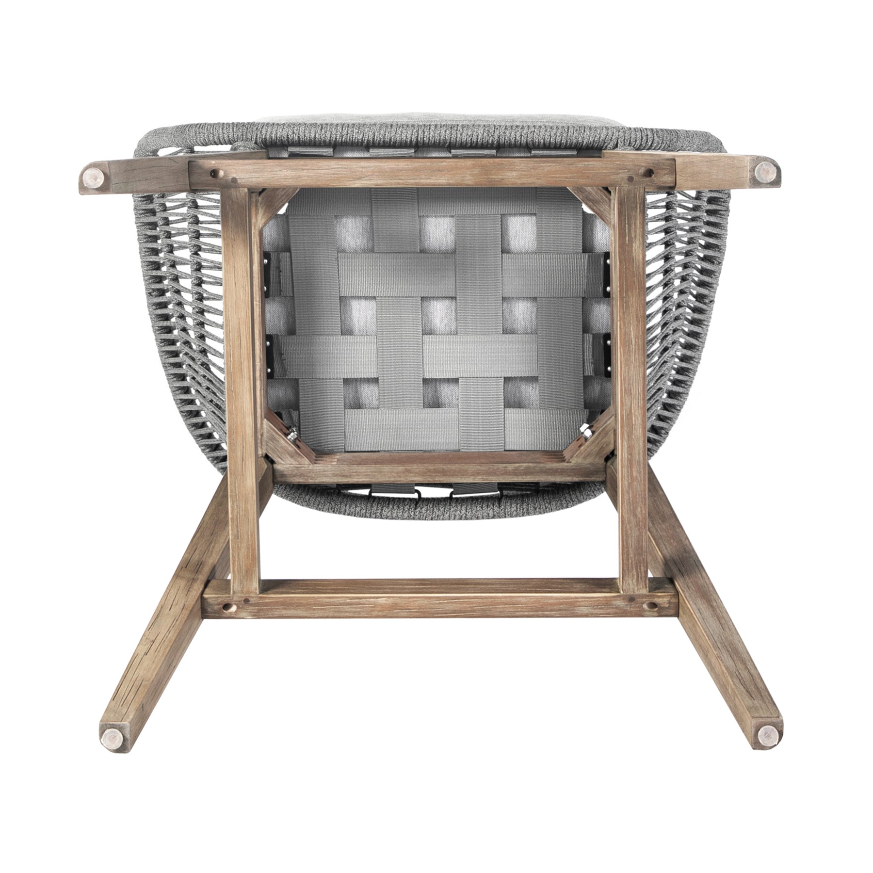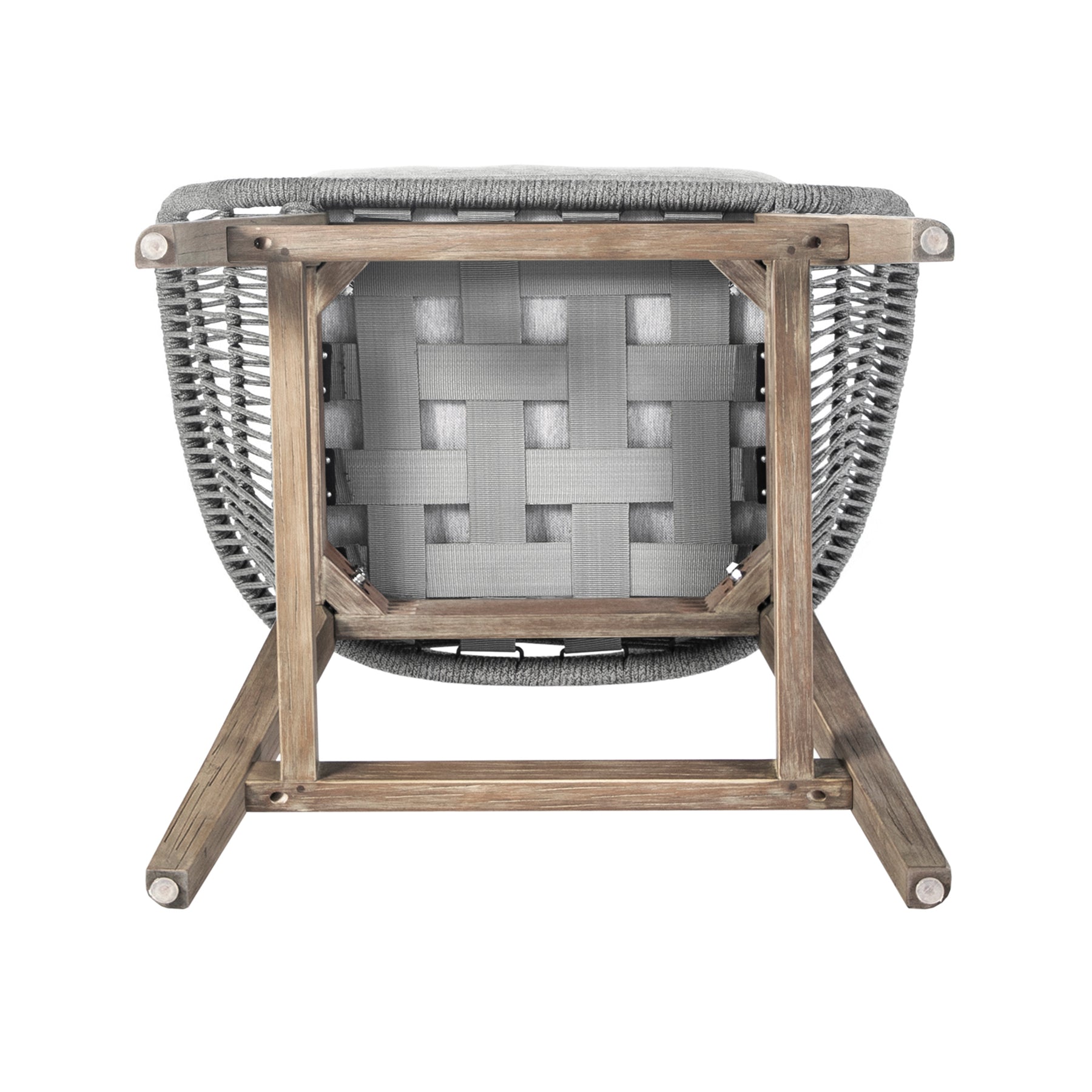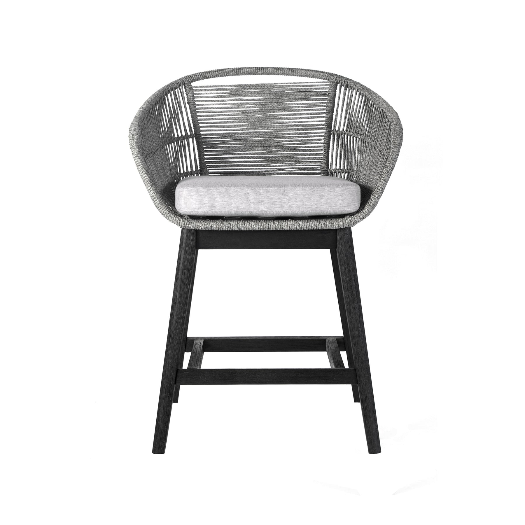 The Tutti Frutti Indoor Outdoor Bar or Counter Height Bar Stool in Wood with Gray Rope from Armen Living is the quintessential choice of an outdoor bar stool that will give your indoor or outdoor living area a whole new aesthetic and presentation for you to enjoy. Featuring a eucalyptus wood base, the Tutti Frutti is durable and highly weather-resistant giving you years of extra enjoyment thanks to the longevity of these chairs. The incredibly comfortable light gray seat cushion is meant to keep relaxed and alleviate any discomfort. This chair is designed with a unique feature where the frame is wrapped with highly durable and an immensely intricate woven rope - adding a completely new dimension to your outdoor furniture which will last just as long and will be even more eye-catching than conventional outdoor frame material. Pair with wood surfaces for an eclectic boho feel, or with concrete surfaces for a modern retreat. Its sturdy eucalyptus base is paired with an intricate marine-grade Regatta cord seat and topped with a soft cushion for a lesson in style and comfort. The rounded back gives ample support for lounging in your backyard, home bar, garden terrace, screened in porch, or poolside! The Tutti Frutti bar or counter height stool is available in your color choice of Eucalyptus wood with a black brushed or ligh eucalyptus finish and shades of gray rope with a light gray cushion.Product Dimensions