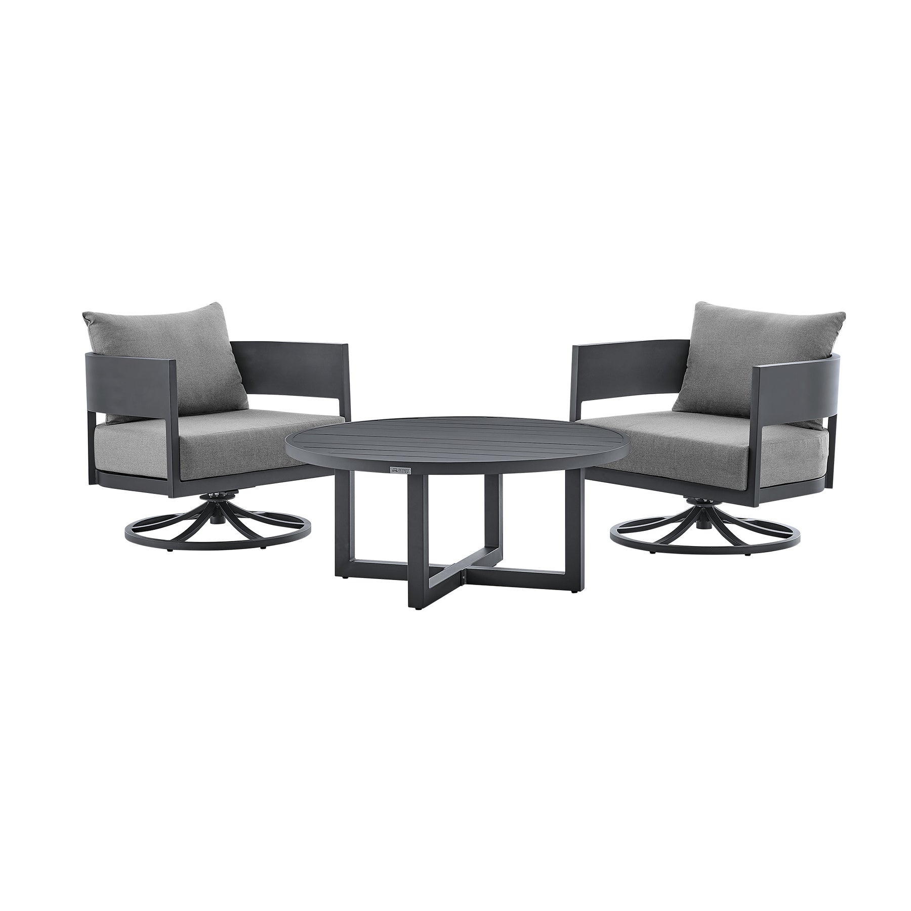 The Menorca 3 Piece Patio Outdoor Swivel Seating Set in Dark Grey Aluminum with Grey Cushions elevates the style of any outdoor space. The 360-degree swivel and rocking motion allows optimal mobility and convenience. Featuring a modern and elegant design, this outdoor furniture set remains a versatile addition to any setting. This swivel chairs embrace a barrel silhouette to wrap you in comfort. The dark grey cushions are removable and feature a zipper closure, making clean up a breeze! The Menorca patio furniture set features high-quality materials that come together gracefully for a look that is well-suited to your backyard, patio, pool area, garden, or screened in porch. The slatted tabletop design creates a drain effect that allows for the outdoor elements to easily pass through. The aluminum construction is durable and stylish. Some outdoor furniture made of wood, iron, or steel, can be difficult to move around because of its weight. If you are looking for something light, then aluminum makes for a great option! If you need to redecorate your outdoor living space, or if you are moving to a different location, then you will have no problems in terms of moving your aluminum patio furniture. Minimal maintenance is required for aluminum. Often, using a typical garden hose to rinse off the patio furniture will do. For more stubborn residue, a little warm water and soap will usually suffice. Aluminum furniture cannot rust. This is especially beneficial in areas where moisture is present, making it a premium choice among residents of coastal cities or regions with high humidity. This unique 3-piece patio furniture set comes in a black aluminum finish with dark grey cushions.