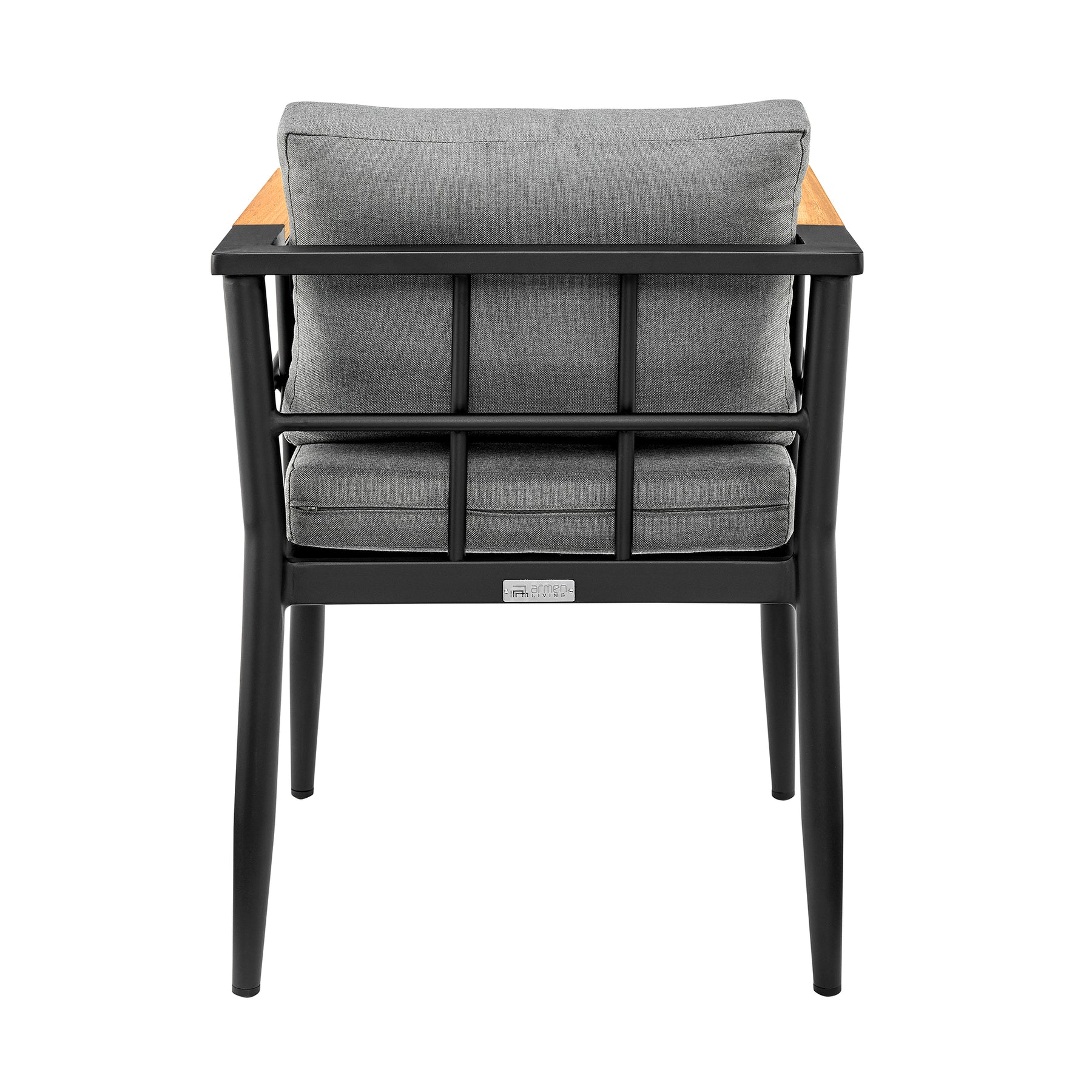 Add a touch of modern beauty to your indoor or outdoor space with the Ezra Patio Aluminum and Teak Dining Chairs – Set of 2 from Armen Living. Featuring a geometric barrel style design that provides ergonomic properties to keep your back properly aligned, the Ezra is a true work of art and is the ideal piece of outdoor patio furniture. The teak accents on the arms give the outdoor chairs with cushions a warm touch, strong and durable, teak can last for generations in a wide variety of climates with zero maintenance. This is due to the high rubber and oil content of the wood that leave it impervious to rain, weather, and pests, making it virtually immune to rot. These patio dining chairs includes plush dark grey high density foam cushions to offer a wonderfully comfortable sitting experience. The cushions also feature a zipper closure that allows for easy removal and cleaning! Featuring an inviting and versatile design, the patio dining chairs sit easily in any outdoor or indoor setting. These outdoor furniture pieces are made up of lightweight and durable aluminum framework. The Ezra chairs are easily portable and feature a multi-layer powder coating for further effective protection from the elements and everyday wear and tear. This is a perfect piece to use indoors and is treated to withstand being outdoors. The Ezra chairs are a unique addition to any backyard, garden, pool area, or screened in porch! The Ezra chairs are available with a black powder coated finish and feature beautiful natural teak accents and dark grey upholstery. The Ezra patio dining chairs are sold as a set of 2, have a seat height of 18 inches and can support up to 308lbs per seat.