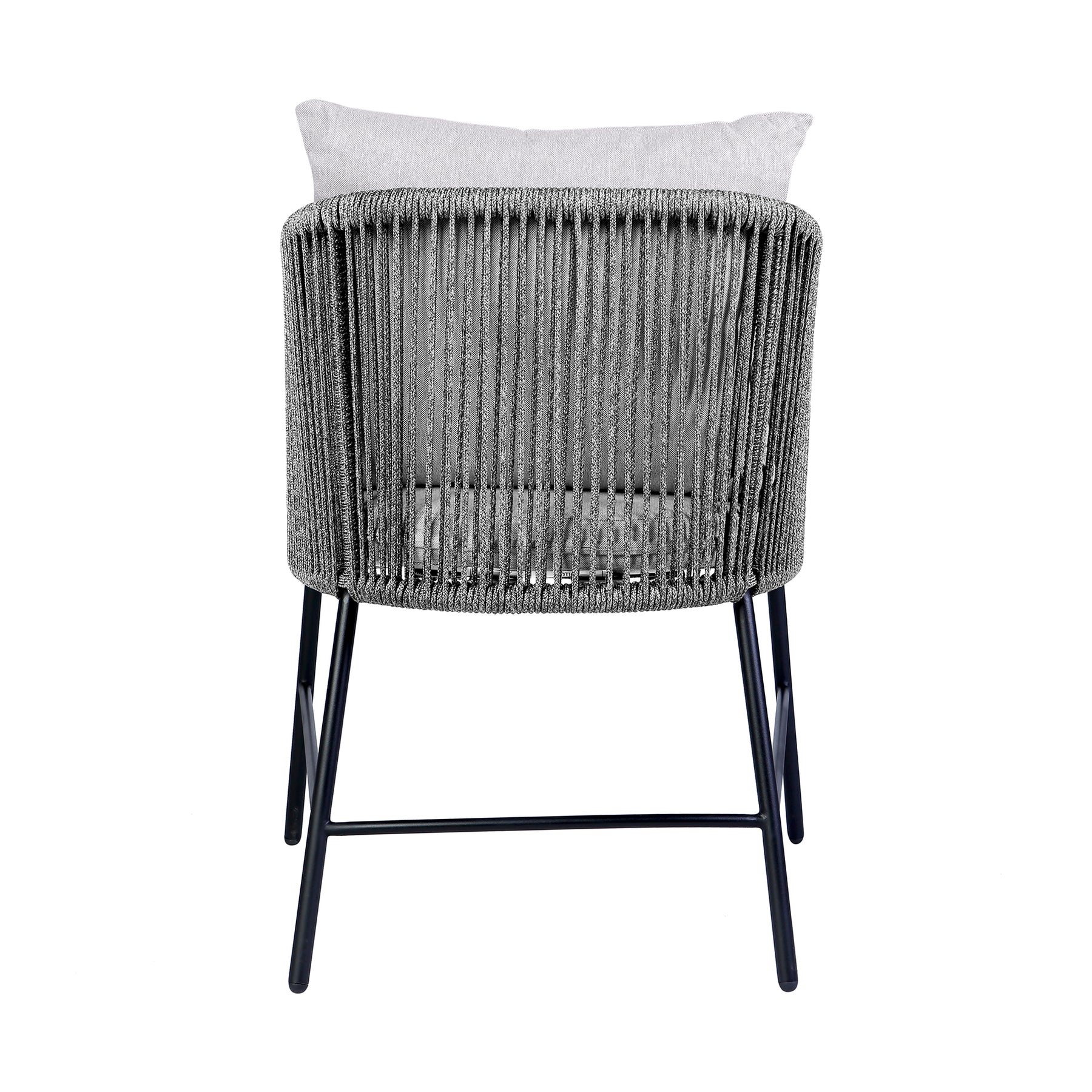 Dine outdoors in style with our Ditas patio dining chair. The curved and sheltering back of the chair is upgraded with an elegant weave. Crafted with resilient and weather resistant grey rope, the weave greatly accentuates the visual and tactile feel of our outdoor armchair. This patio chair sits upon slender black steel legs to serve as a sleek and stylish addition. Steel does not dent or get bent out of shape as easily as some aluminum furnishings can. Lighter than wrought iron but heavier than aluminum, steel provides strength, stability, and endurance in extreme temperatures. Featuring a comfy cushion and a boxy seat, our outdoor dining chair effortlessly combines style and comfort, while the zipper closure allows you to remove the cushion covers for easy cleaning! Moisture and water are ongoing concerns for outdoor furniture. Even if your outdoor furniture stays out of the rain, condensation is likely going to build up on the furniture regularly. Polyester is not permeated easily by water. Secondly, polyester resists the types of molds and mildews that will take root in fabrics made of natural fibers. This means the patio furniture will have a longer life with polyester upholstery. Looking fresh in all seasons, our durable outdoor dining chair remains the perfect complement to your patio, backyard, or balcony. This patio chair conveniently ships fully assembled and can be used right after unpackaging. The Ditas outdoor dining chair features a grey rope weave, durable black steel legs, and grey upholstery on the cushions.