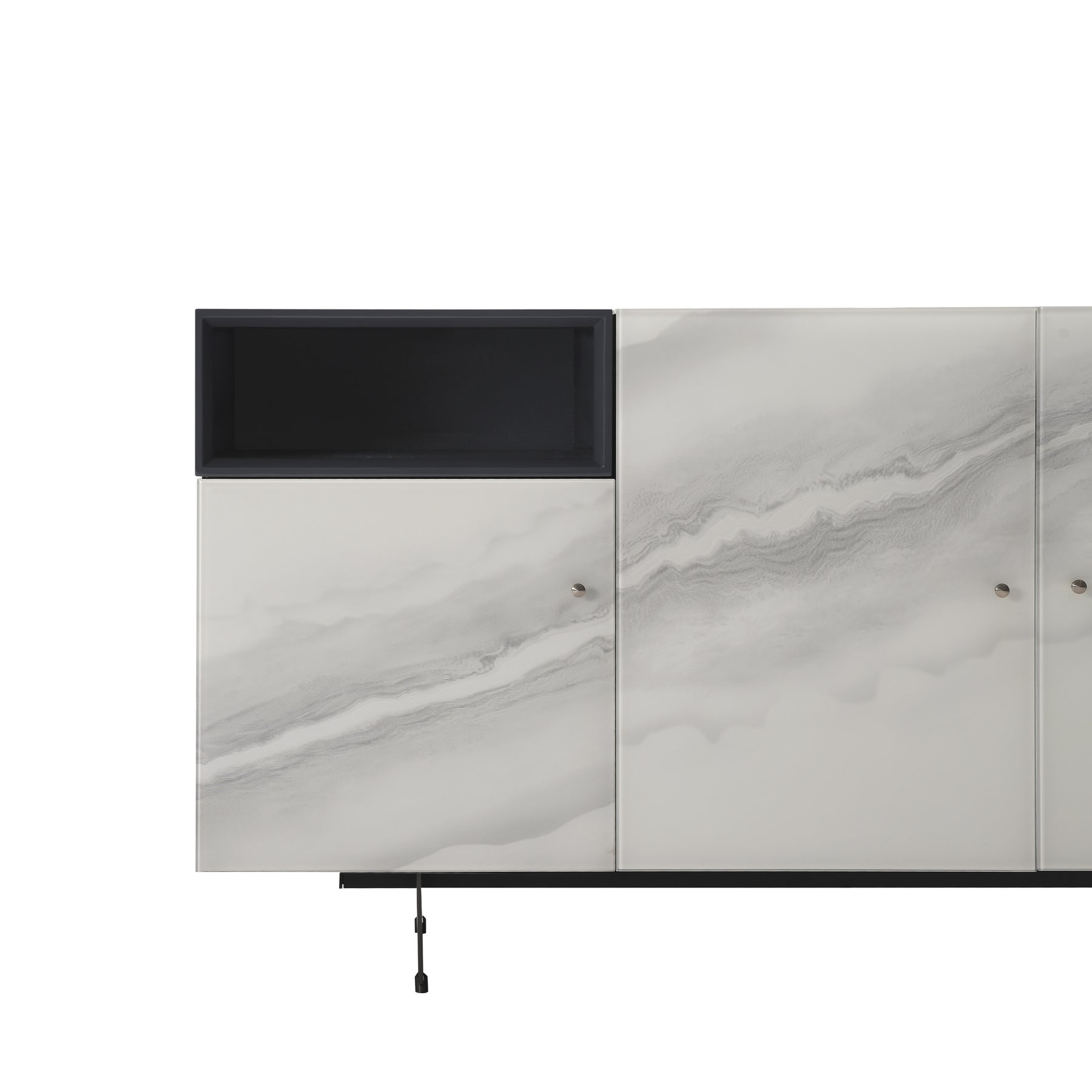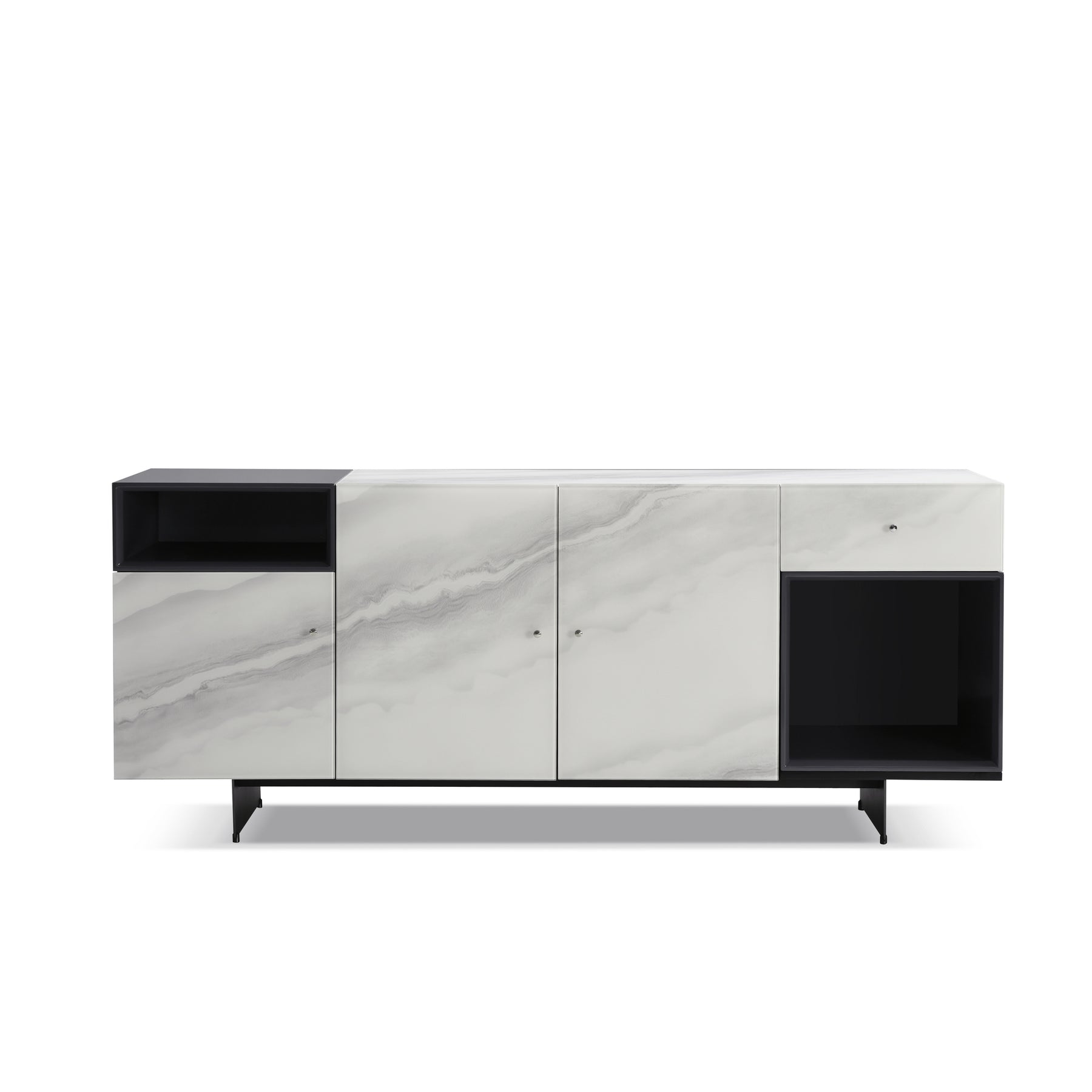 Elevate your storage game with the Olivia Modern Sideboard, a striking blend of contemporary elegance and practical design. Featuring three doors with a stunning white marble-effect tempered glass front, this sideboard instantly catches the eye with its sleek contrast against the deep black open shelving. The clean lines and straight-leg base reinforce its modern profile, while the tempered glass adds a subtle sheen that enhances its upscale appeal. Crafted from a durable combination of wood, tempered glass, and metal, the Olivia sideboard provides both visual appeal and long-lasting functionality. Ideal for dining rooms, living areas, or hallways, this cabinet is as functional as it is beautiful. Its spacious interior offers ample room for dinnerware, linens, or miscellaneous essentials, while open cubby sections are perfect for displaying décor or storing everyday items within easy reach. Thoughtful design details include integrated rubber floor protectors to prevent scuffs and scratches, and all necessary assembly tools are included to simplify setup. Whether used as a dining buffet or an accent piece in a modern interior, the Olivia sideboard makes a strong statement without overwhelming your space..
