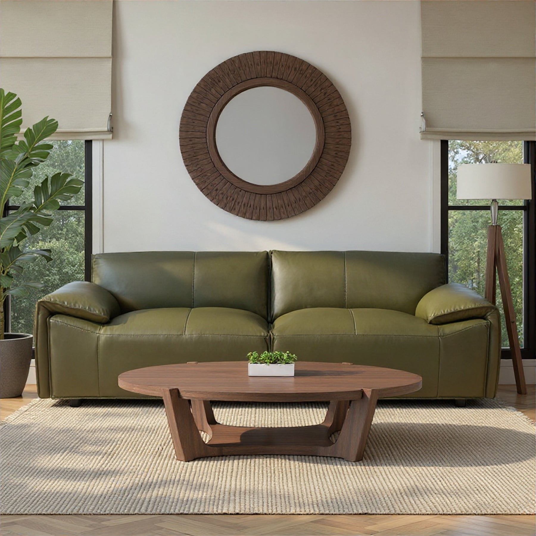 Set the tone for a polished, comfortable living room with the Tanner 92 in. Leather Sofa, available in Green or Khaki. This is the statement piece that balances clean geometry with sink-in comfort: a squared, low-back silhouette; wide, padded arms; and smooth, top-grain genuine leather that instantly elevates the space. At 92 inches wide, Tanner offers generous seating for three, making it an easy choice for gathering with family, hosting friends, or stretching out solo with your favorite show. The tailored cushions deliver that just-right feel—supportive for posture, plush for relaxation—so it looks crisp and lives comfortably day after day. Crafted on a sturdy wood frame and grounded by discreet rounded feet, the Tanner Sofa is built for long-term use without visual clutter. The genuine leather upholstery is durable, soft to the touch, and simple to maintain—just wipe clean with a damp cloth to keep the surface looking fresh. Plus, because assembly is minimal, setup is simple and fast, so you can get straight to the good part: enjoying your space. The two colorways make styling effortless: Green introduces a sophisticated, design-forward accent that pairs beautifully with black metals, natural oak, and neutral textiles; Khaki delivers warm versatility that complements modern, transitional, and cozy layered spaces alike. From everyday lounging to entertaining, Tanner brings together the durability you need and the modern look you want.Product Dimensions