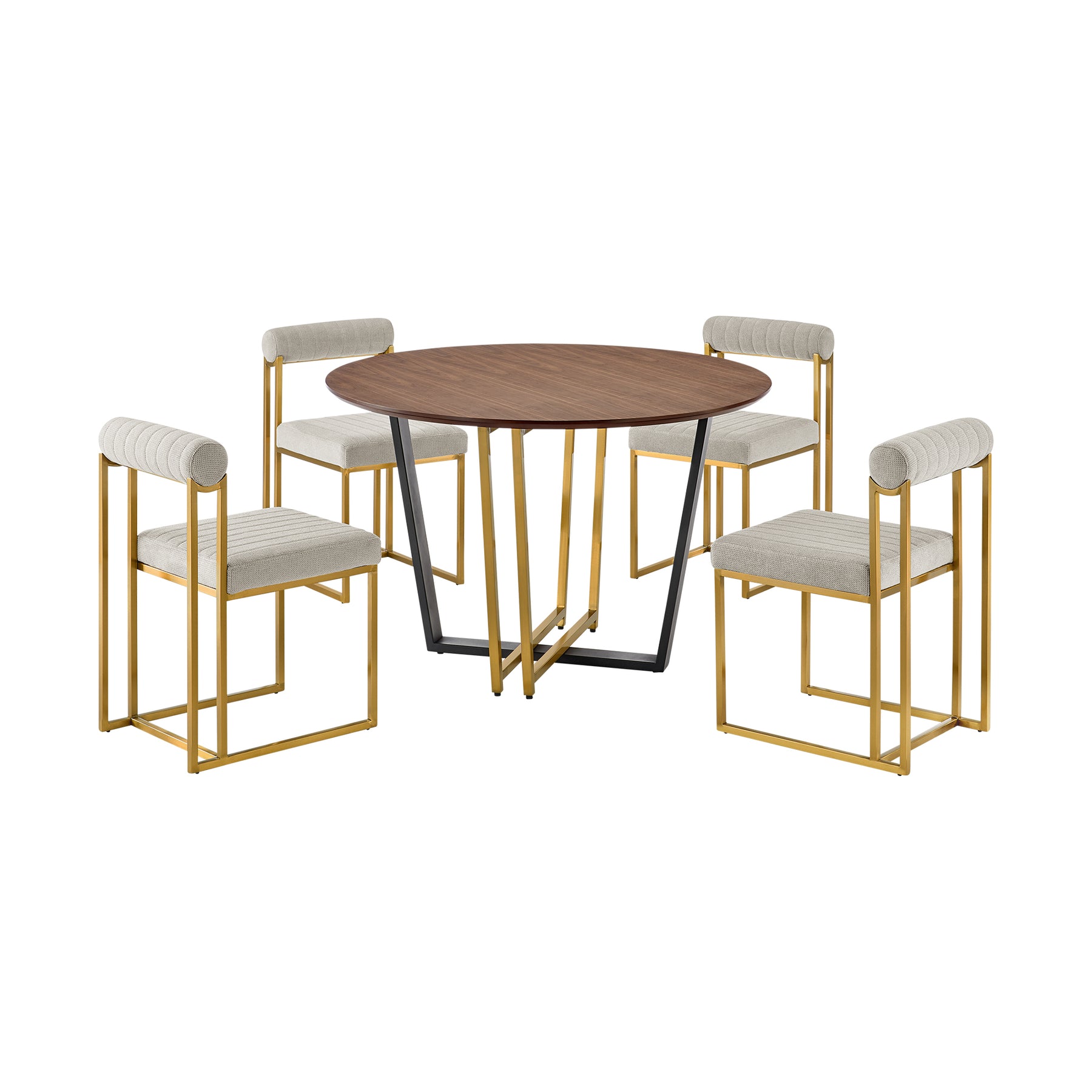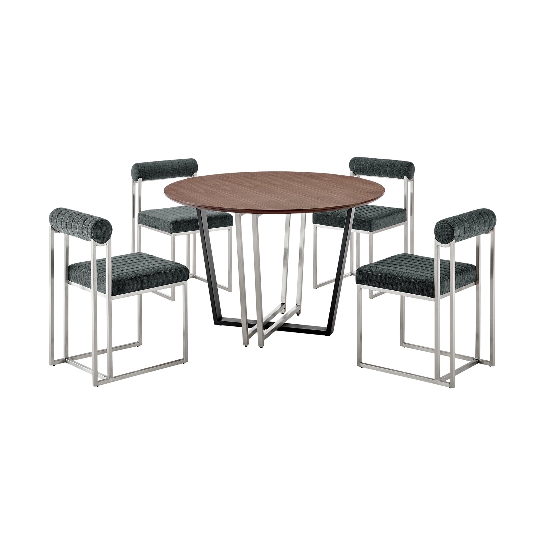 Make a modern and sophisticated statement with our Joana Anastasia 5 Piece Dining Set by Armen Living. This set includes 1 Joana Round Walnut Dining Table with a mixed metal base and 4 Anastasia Dining Chairs in Fabric and Metal. The crisp lines and a compelling blend of materials and finishes bring eye-catching charm and elegance to this dining set. The round tabletop features a classic walnut veneer to showcase the rich finish and natural textures of the wood. The 48" round tabletop rests upon a clean-line, geometric base to offer a sleek and modern design. Our dining table can serve as a stunning companion to the striking and stylish Anastasia dining chairs. A cylindrical cushion is beautifully balanced upon its airy frame to offer comfortable back support. Its cushioned backrest and padded seat showcase a neat channeling detail that provides texture for a chic and inviting look. The Anastasia chair is upholstered in performance fabric to offer easy care and maintenance. Altogether this dining set serves as a fashionable and versatile fit to your kitchen, dining, or living space. This dining set features high-quality materials and craftsmanship to create a sturdy foundation for dinners, conversations, and activities. The Joana Anastasia 5 Piece Round Walnut Dining Table Set is available in matching finishes and a variety of colors, or sold separately to achieve any look you desire..
