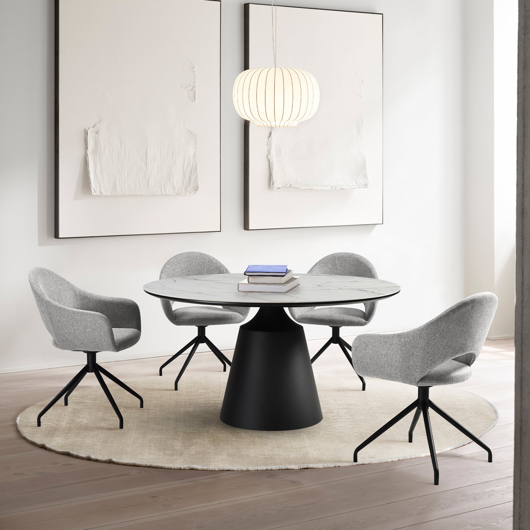 Enjoy an intimate meal or host a dinner party with the Knox Pria 5 Piece Dining Set with Stone Top and Grey Fabric Chairs from Armen Living. This set includes 1 Knox dining table, and 4 Pria swivel dining chairs. Streamlining the iconic mid-century modern silhouette, this dining chair presents the perfect blend of style and functionality. It features beautifully curved and seamlessly flowing back and arms. Finished off with a sleek cut-out, the chair attains a sculptural presence in any room. It is completed with pyramid-shaped black metal legs to serve as a sturdy and stylish addition to any room. The curved back and armrest of the chair are generously padded to envelope you in comfort. A cushioned seat offers a comfy stay, long after the meal is over. From offering a comfortable dining experience in your kitchen, to serving as a comfy seat in your home office or as an accent chair in your living room, our chair remains a must-have for any modern or contemporary home. It includes a 180-degree swivel function to allow for maximum mobility and lingering conversations. The refined and distinctive silhouette of the dining table attains a statement-making appeal in any room. It features a perfectly rounded tabletop perched upon an eye-catching pedestal base. Its stone tabletop depicts the graceful and natural textures of white marble to add a polished touch to your casual or formal meals. It is perched upon a black metal base to attain contrast and a versatile appeal. The round dining table can comfortably seat up to six individuals for enjoying meals in your kitchen, dining room, or living space. A 55Â round shape allows the table to function as a natural hub for conversations. The Knox Pria dining set is available in 5 or 7 piece set configurations and features a white stone tabletop with black metal base and grey upholstered swivel chairs with black metal legs.Product Dimensions