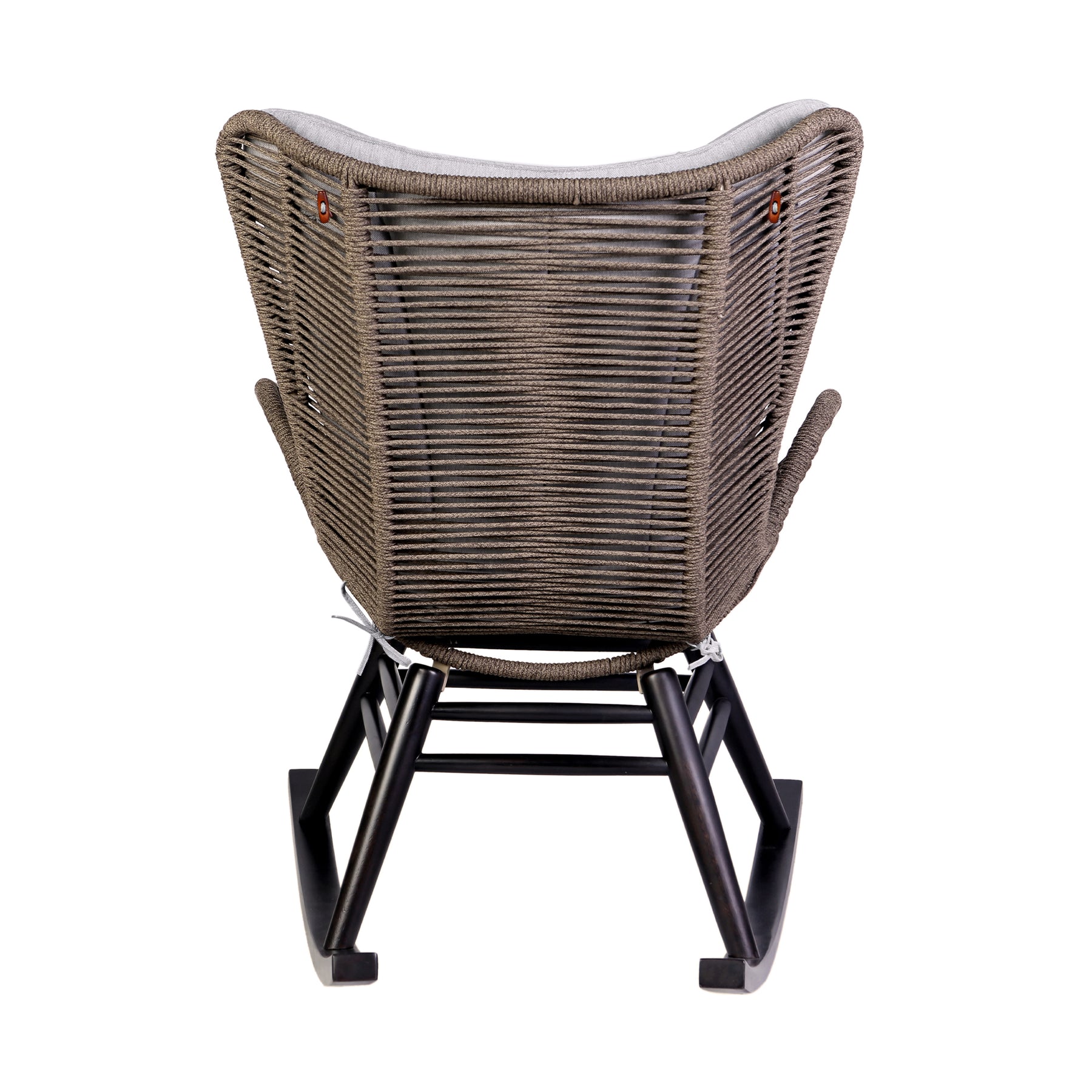 Embrace a comfy retreat with our Mateo outdoor rocking chair in eucalyptus wood and rope. The dynamic and sculptural profile of the rocking armchair is accentuated with an elegant rope weave. The modern charm of the resilient and weather resistant rope harmoniously pairs with the architectural eucalyptus base. Featuring an elongated seat that seamlessly flows into the armrest and a gracefully curved back, our outdoor accent chair simply wraps you in comfort. Its expertly tailored cushioning follows the contours of the chair for an utterly comfortable stay. The cushions and frame are UV resistant, ensuring it will last for many years to come. Moisture and water are ongoing concerns for outdoor furniture. Even if it stays out of the rain, condensation is likely going to build up. Polyester is not permeated easily by water. Secondly, polyester resists the types of molds and mildews that will take root in fabrics made of natural fibers. This means the patio furniture will have a longer life if it is upholstered in polyester. One of the best reasons to choose Eucalyptus wood for your outdoor furniture is that it is exceptionally resistant to decay and rot. It naturally resists the influence of moisture because of the high oil content it naturally contains. That means it can get damp without you worrying about whether damage will occur. It can withstand several different outdoor elements while lasting for many years if it receives proper care. The durable outdoor accent chair effortlessly invites lounging and relaxation. Its universal style can allow it to flow throughout your home wherever it may be needed. Available with a in a light eucalyptus finish with charcoal rope and grey cushion, or a dark eucalyptus finish with grey rope and grey cushion, our stylish lounge chair can serve as the perfect complement to your patio, balcony, living room, or nursery!